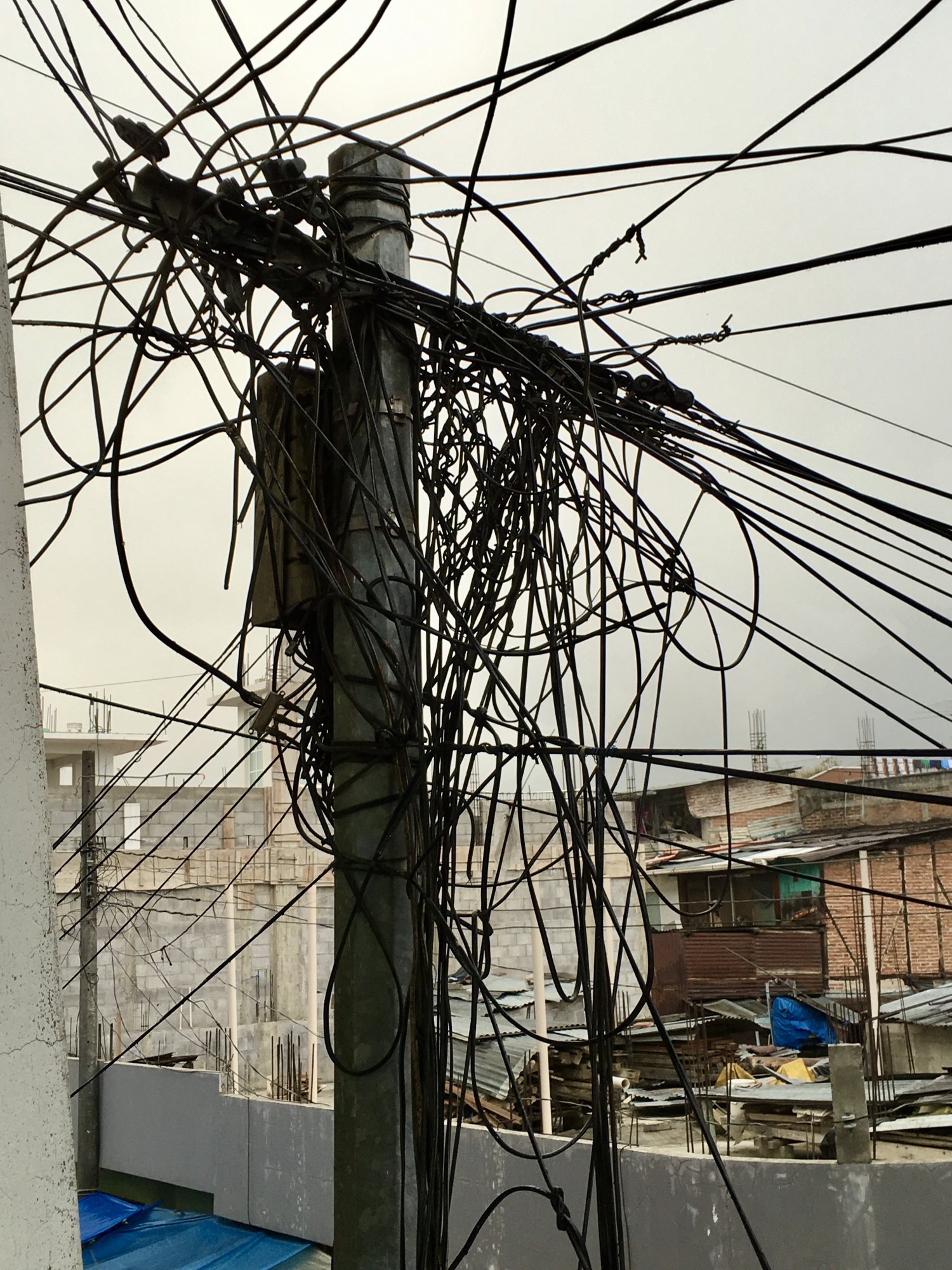 Is this a “firewire“ 1394 connection?😁While at a multi-level outdoor shopping "mall" in Quetzaltenango, Guatemala several years ago, I looked over the exterior wall and saw this communications nightmare.