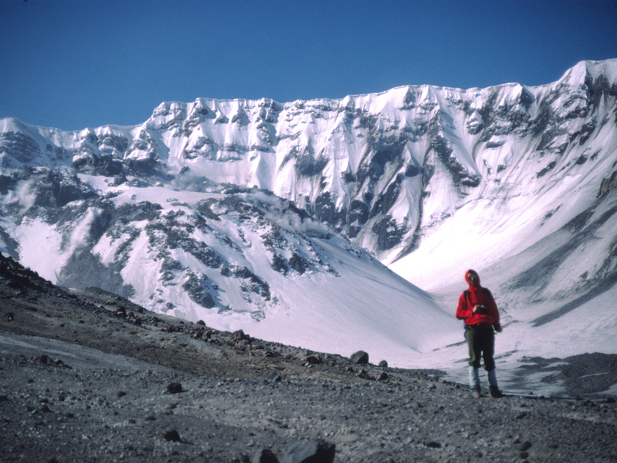 My cousin in Portland was born the day before it erupted!Slide scan. My buddy in the crater, Mt. St. Helens. New dome building in the background.