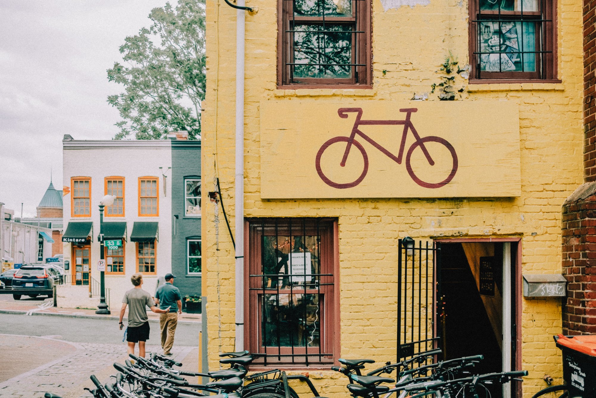 We were moving too fast for me to take multiple orientations, but I do have an alternate image from much further back in the street. Hazards of shooting during a family outing. 😉I really like the subject... If you are able to go back to it I would put the camera in portrait size and have more of the bicycles in it but not the trash bin or the cars on the left. It would be awesome if you can have people moving towards you instead of away and someone in the door opening would be amazing luck. 👍