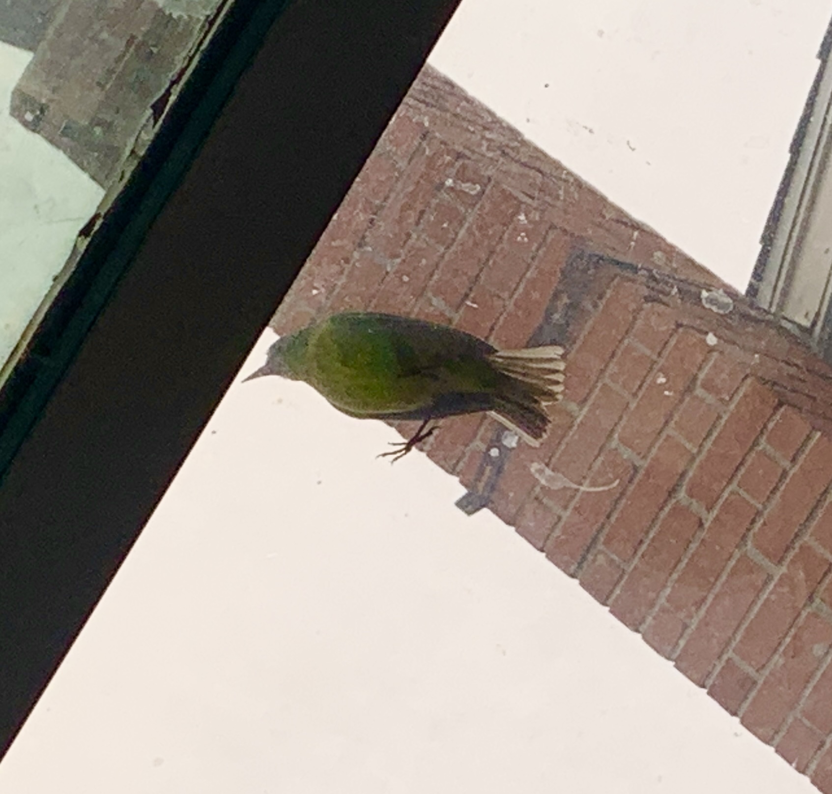 There are two of these fellows, and they have bright yellow breasts (sort of hard to see through the filtered glass window). And for the last five days or so, all day long, they’ve been flying up to the window and pecking at it. The window is heat treated glass so outside has a mirror like surface. They are very timid so I haven’t been able to capture a picture of them outside. Anyone have an idea of what’s going on? I thought maybe they have a nest somewhere and they see their reflection and they’re trying to scare off a competitor?