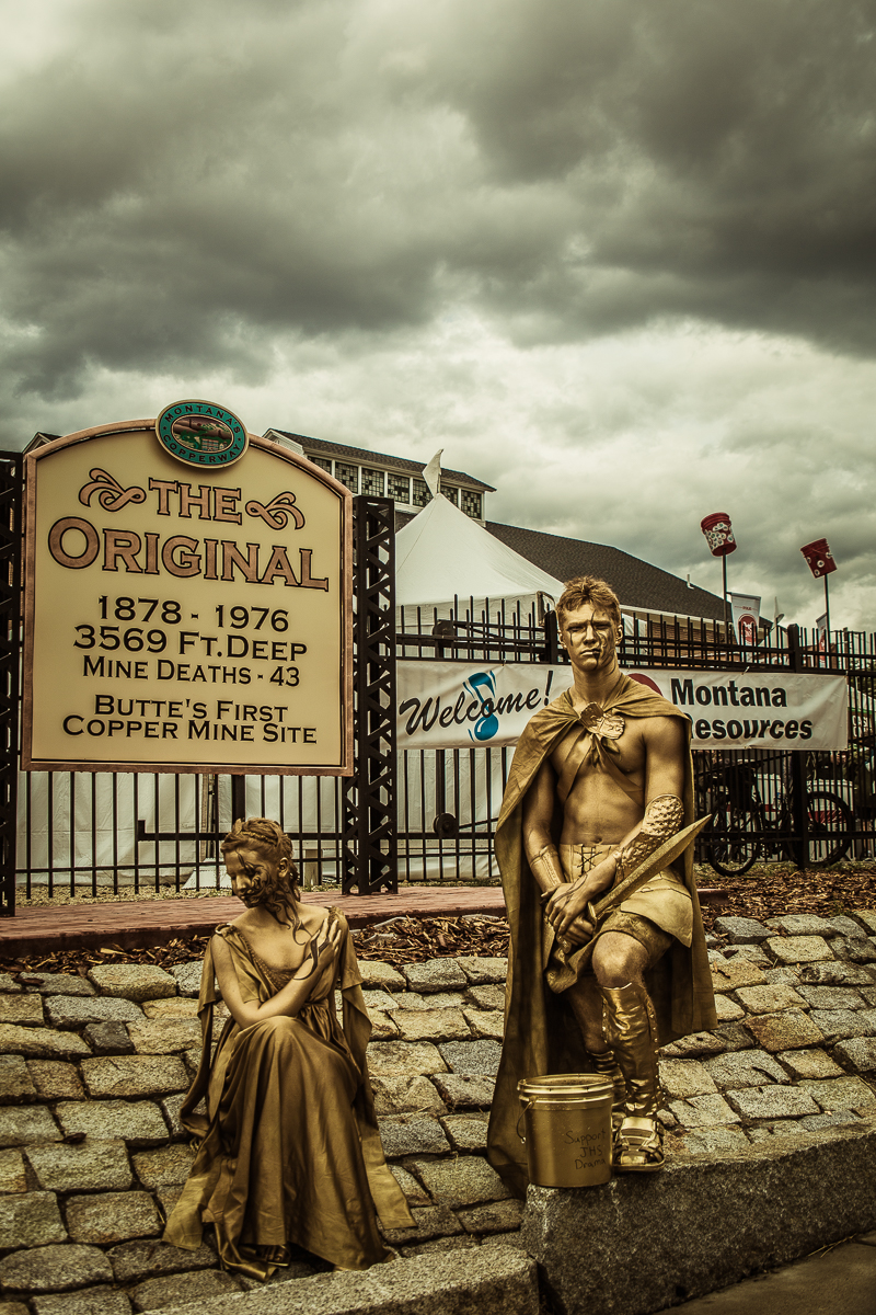 Every year in mid-July, Butte, Montana hosts a free 3 day folk festival with electic bands from all over the world. This year was no different, but we had the added photographic pleasure of weather moving through making for some interesting photos. Here's a photo of some street mimes at the main venue, The Original Mine.