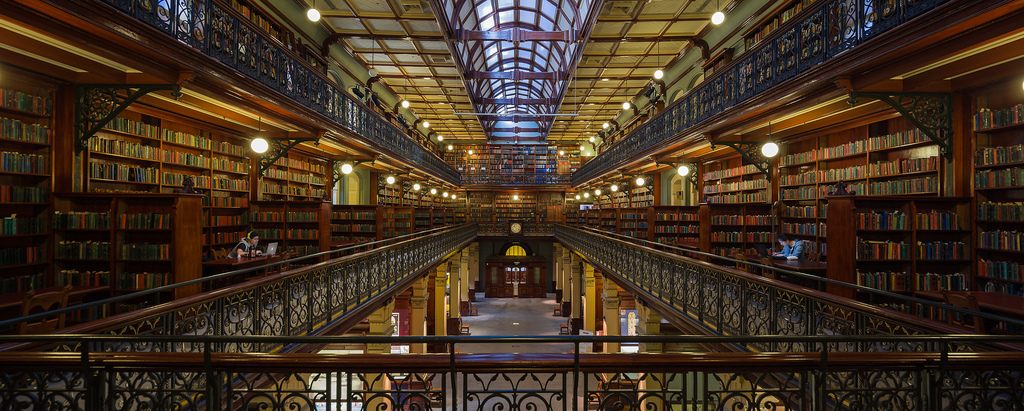 Nice job, I like this image very much. Not underexposed at all.Tilt-shift pano. in the Mortlock Wing of the State Library, Adelaide, South Australia.