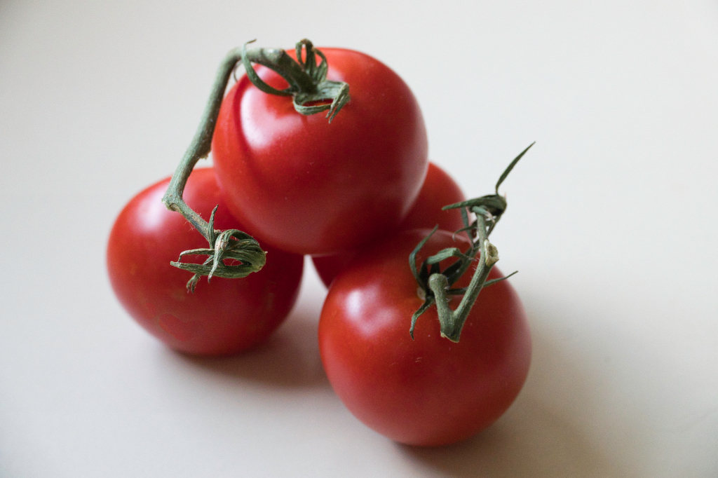 I set a mirror off to the left to capture, reflect and add a bit of extra light. Voila! Probably should have stopped down a little more, though, and/or used EC for better control and maximum sharpness of all four subjects, but I was too caught up in keeping the darned tomatoes in position long enough to shoot and figuring out the exact right distance to be holding the camera.....