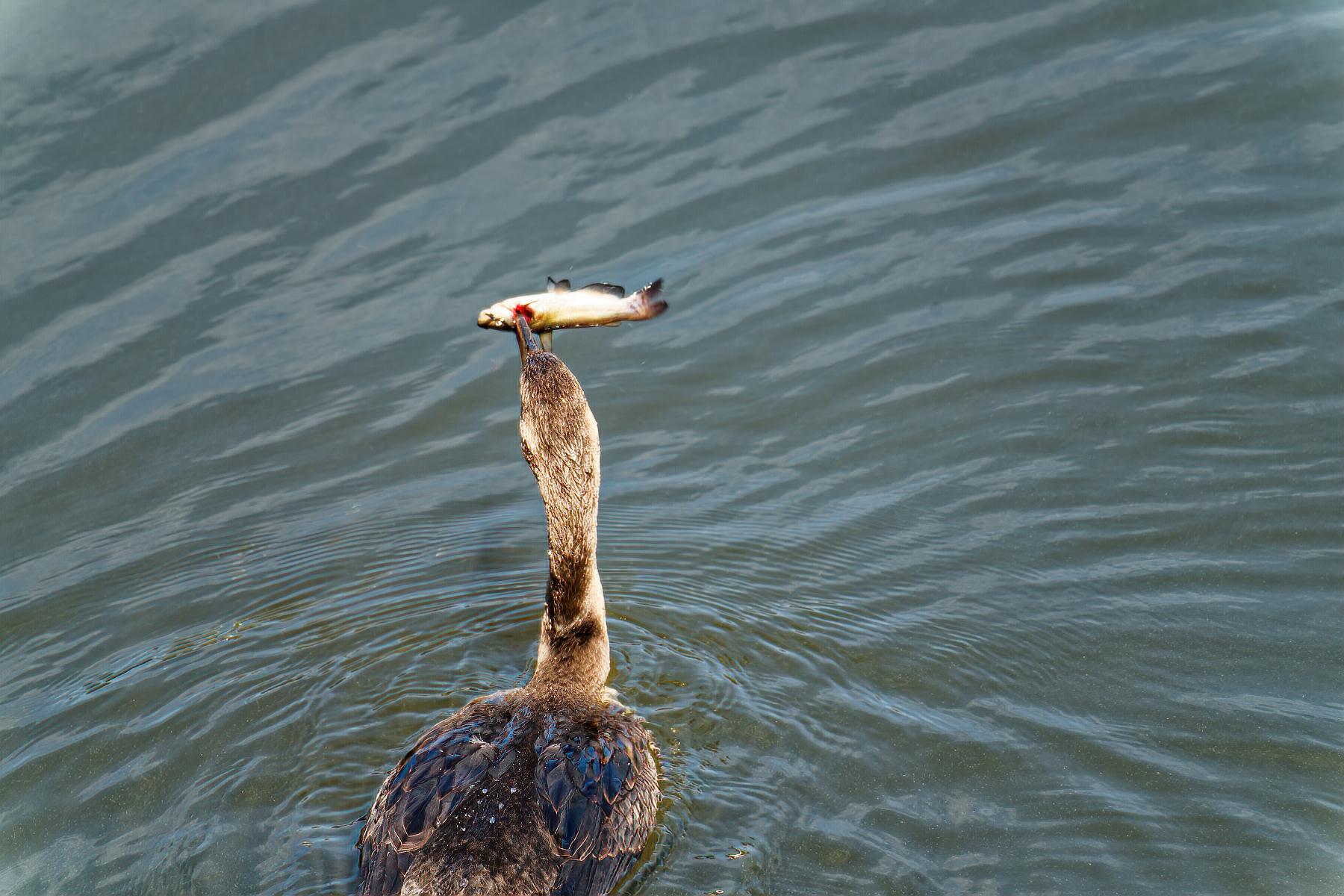 Looks like he’s found breakfast!Had a surprise visitor to the lake this morning -- a juvie Cormorant! (I can't help wondering if this guy is related to Frank, the cormorant I photographed a few weeks ago...) I spotted him out the kitchen window and immediately ran for the camera and the 100-400mm since I wasn't sure I'd have time enough to set up the tripod and the Bazooka. Also he was pretty close, anyway. He leisurely swam around for a while and then ducked under the water and -- voila! Came up with his lunch.