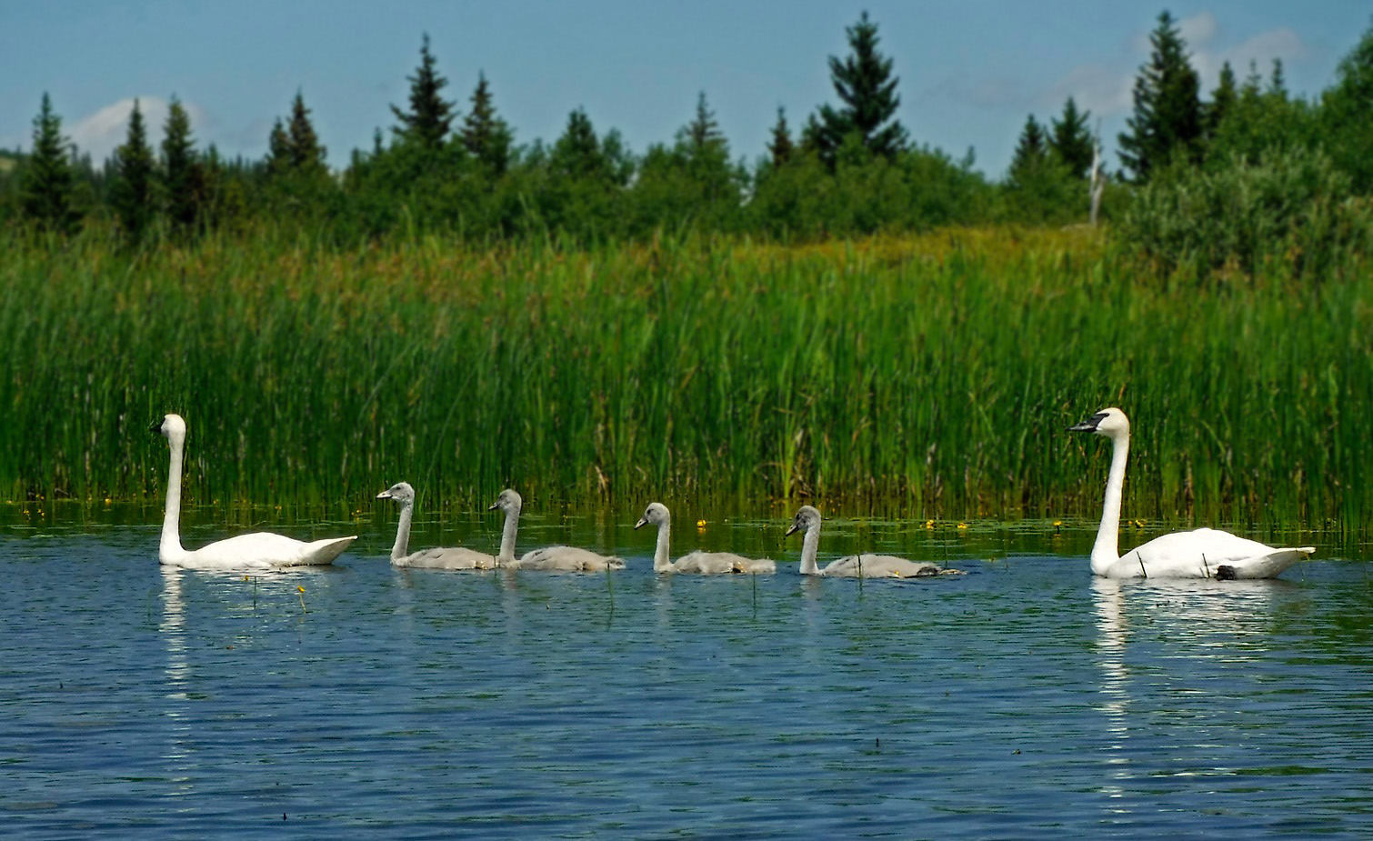 I'm going to miss this lake!!Last of the Beauvais Lake shots. One of the reasons I love to paddle the swampy end of the lake in July is to visit the breeding pair of swans and this year their four cygnets. Technically not a great shot, but it's what I got.