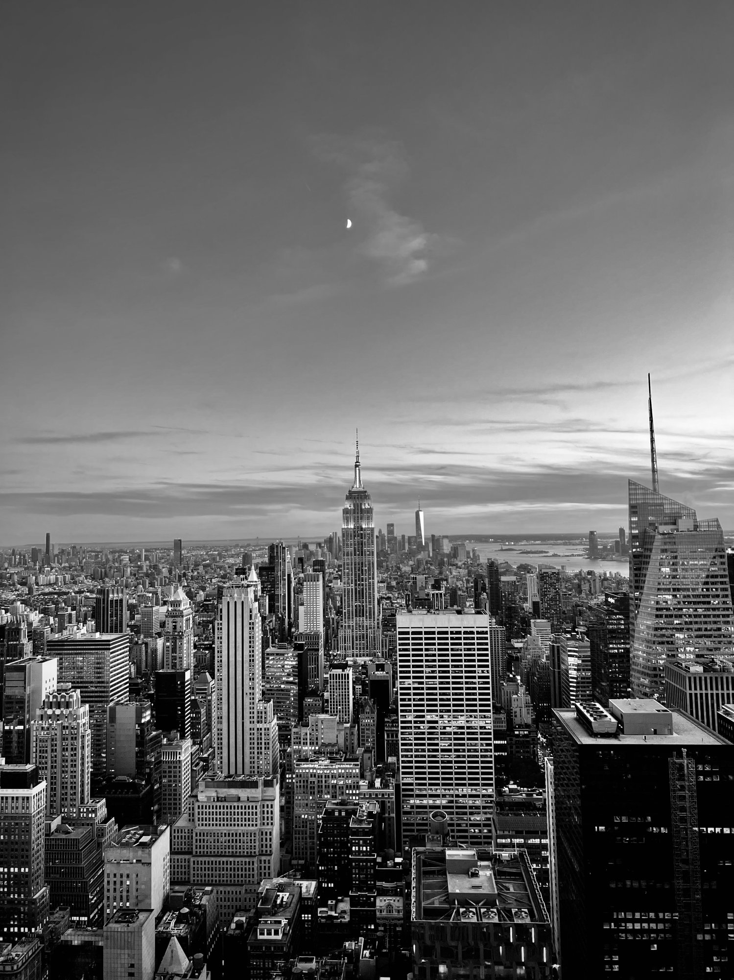 Enjoy this incredible view of the Empire State Building, NYC’s midtown and downtown skyscrapers, and farther on to the Brooklyn Bridge, and the Statue of Liberty and New York Harbor.