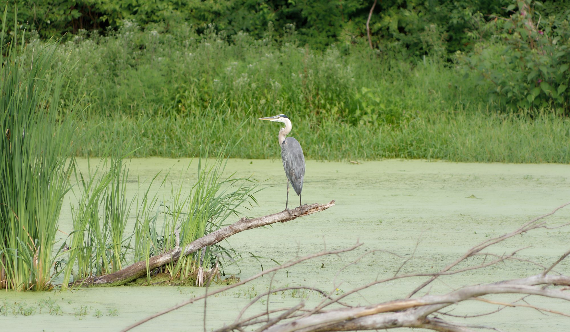 In the water to the left of the main subject, just above where the log disappears into the water, through the opening in the blades of grass.See if you can spot the second bird in this photo.