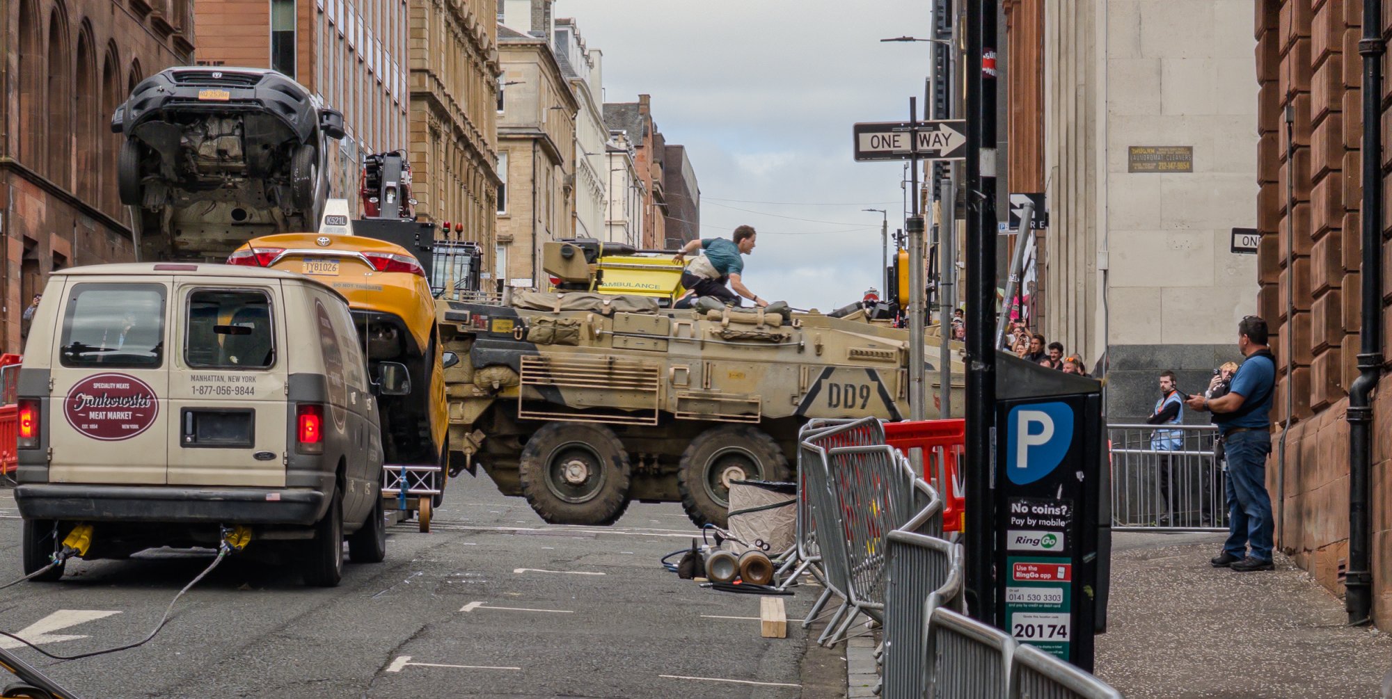 Filming moved St Vincent St at the weekend, same bit as used in Indiana Jones. Today was no filming but cleaning up the mess