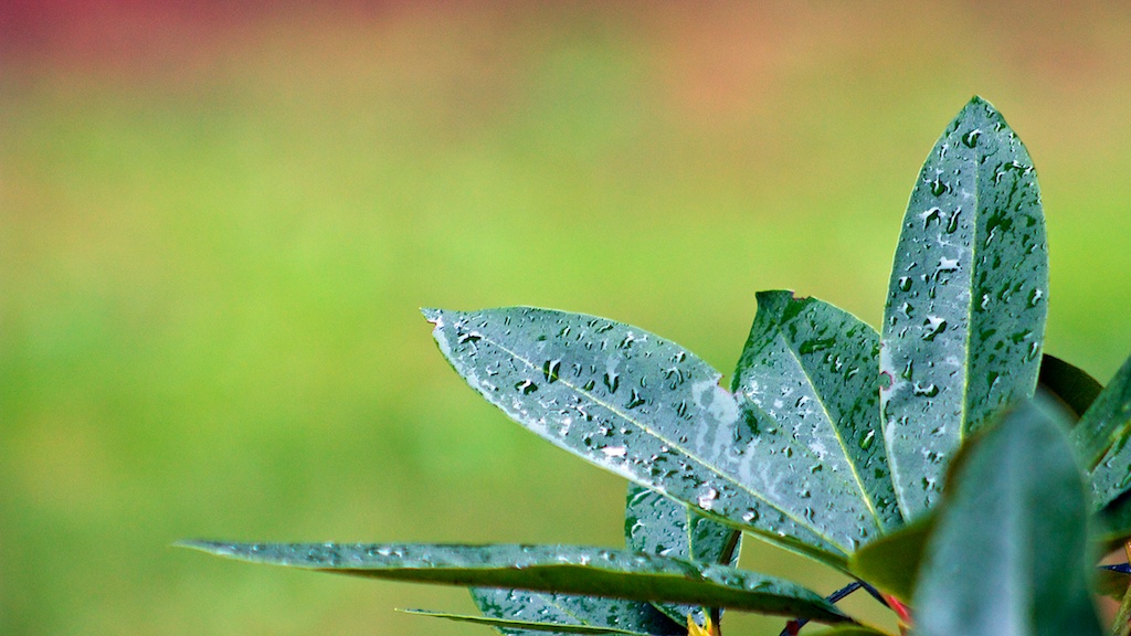 The OOF reddish hues really help the green ones to vibrate. They are right on the edge of the photo, however, so they really draw the eye away from the leaves. If there had been some way to align them closer to the in-focus leaves, that might have been a good solution.
