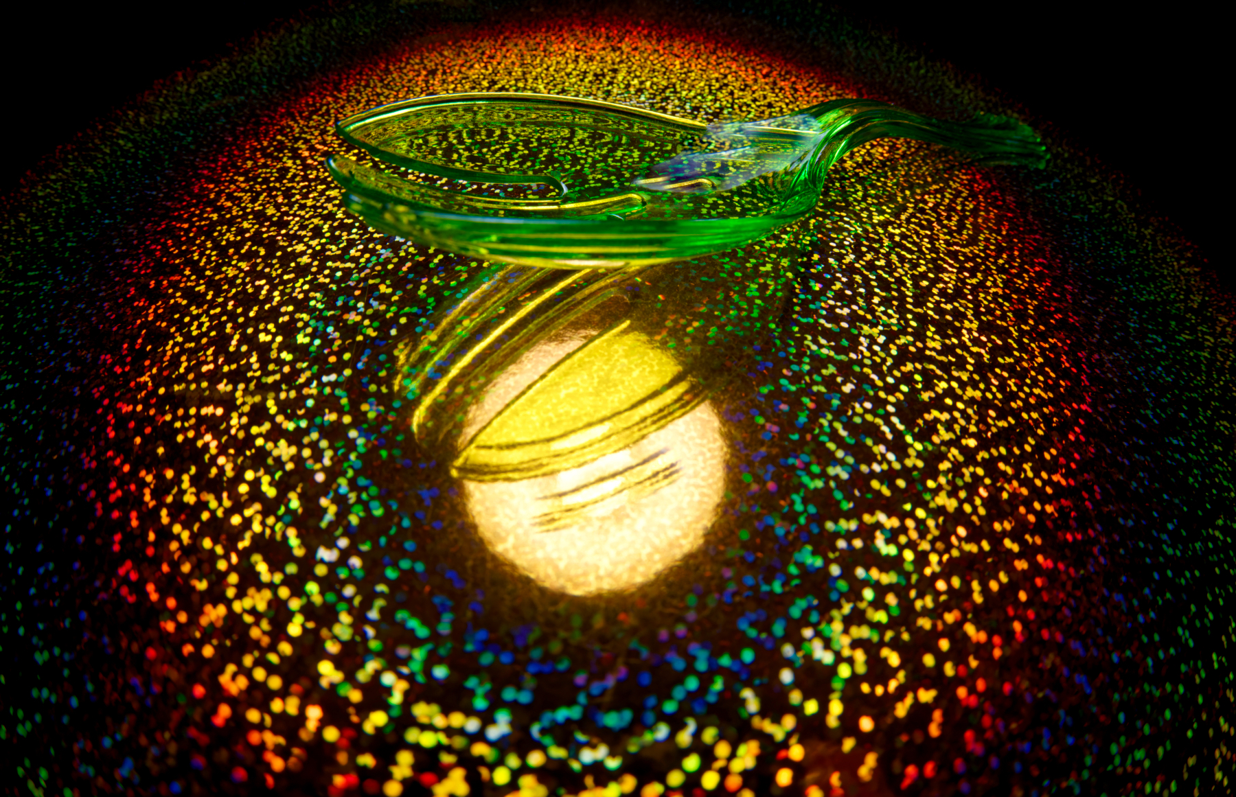 I think it's a green plastic slotted spoon/fork, placed on a stippled reflective surface of some kind, illuminated from above by a lamp that has multi-color fiber-optics around a central lamp, shot at an angle from the reflective surface. Or it's a UFO landing site.