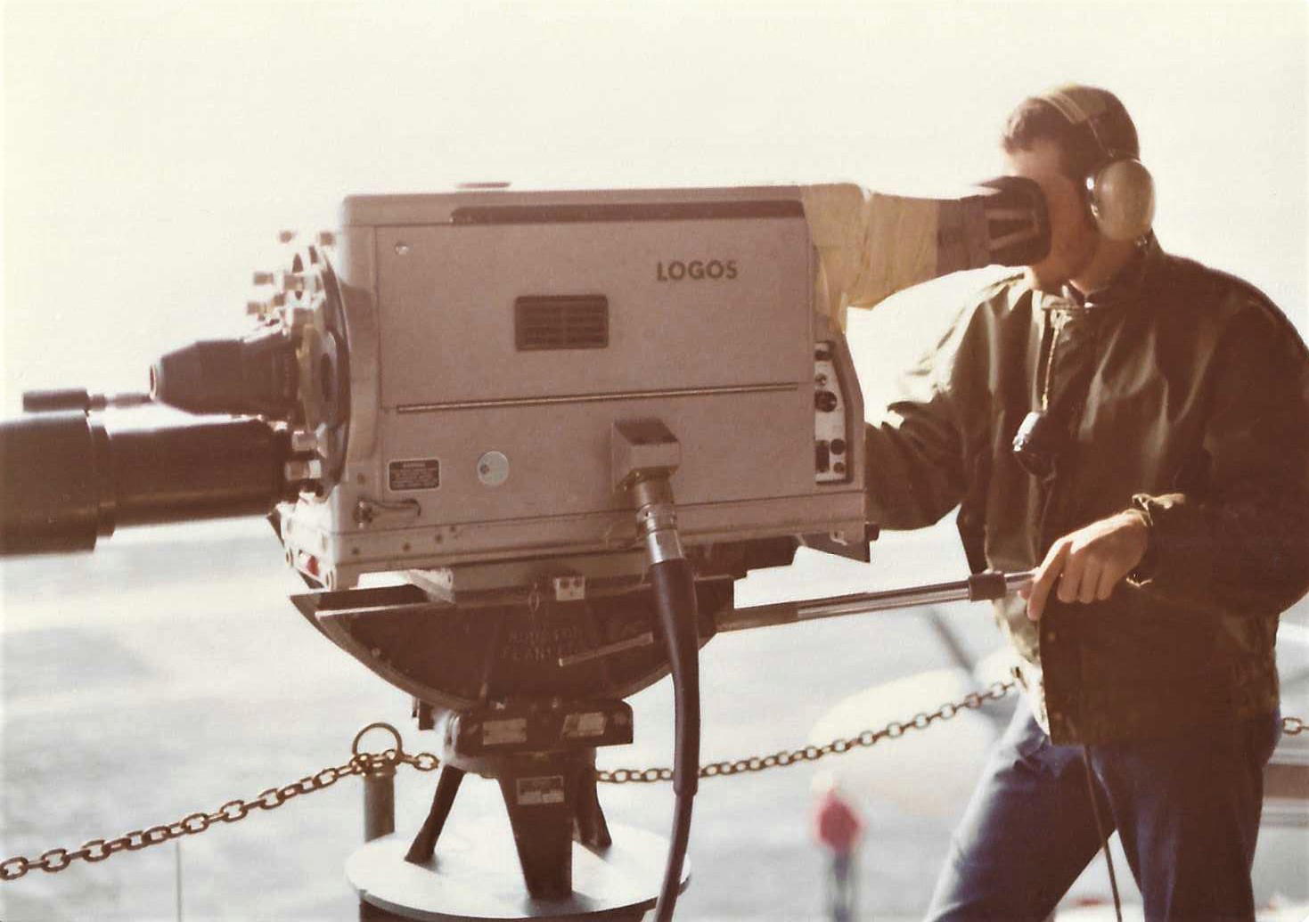 Crappy snapshot a friend took of me operating the flight deck video camera. Look at the size of that thing(1979).