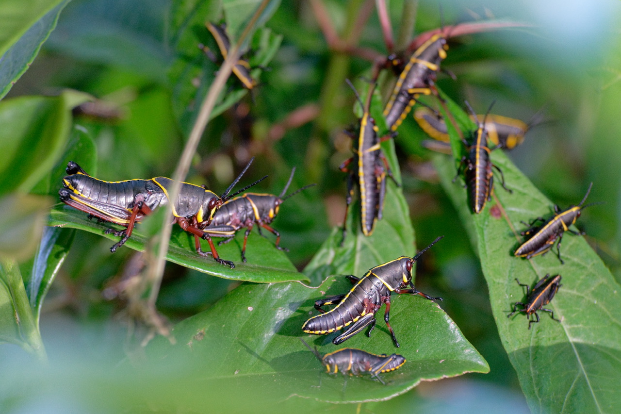 I have never seen that species of grasshopper here in NC. My search says they are called the "Florida lubber grasshopper", native to the south eastern, and south central US. Great photo! Looks like an armored alien invasion.