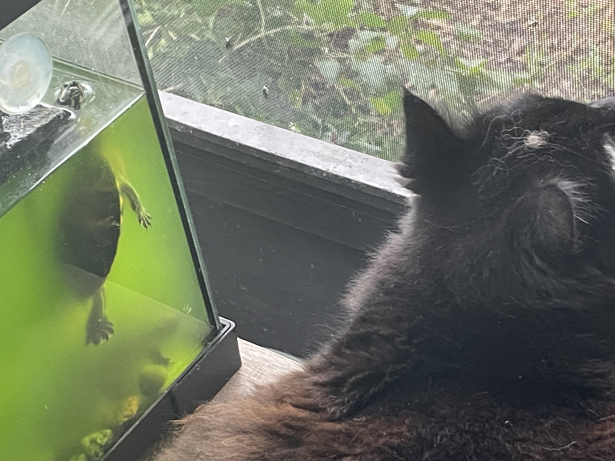 A bird, i thinkWhat your shedding husky (I know first hand) and turtle are looking at? Cute and funny photo