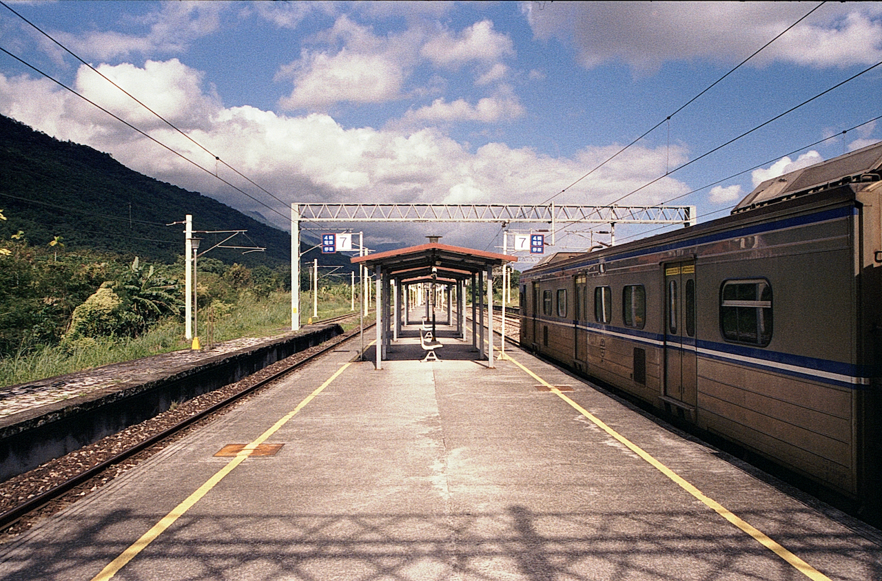 Welcome! Keep'm coming.On the platform at Zhixue Station, a rural train station in Hualien County on the mountainous east coast of Taiwan, "zhixue" meaning something like "the will to learn" in Mandarin Chinese, as this station is located near National Dong Hwa University. Taken with a Nikon F4s and Nikkor AF 28-105 f/3.5-4.5 lens at f/16 and 1/500 sec. (per sunny 16 rule) on Kodak Gold 200 pushed 1 stop, developed and scanned at home.