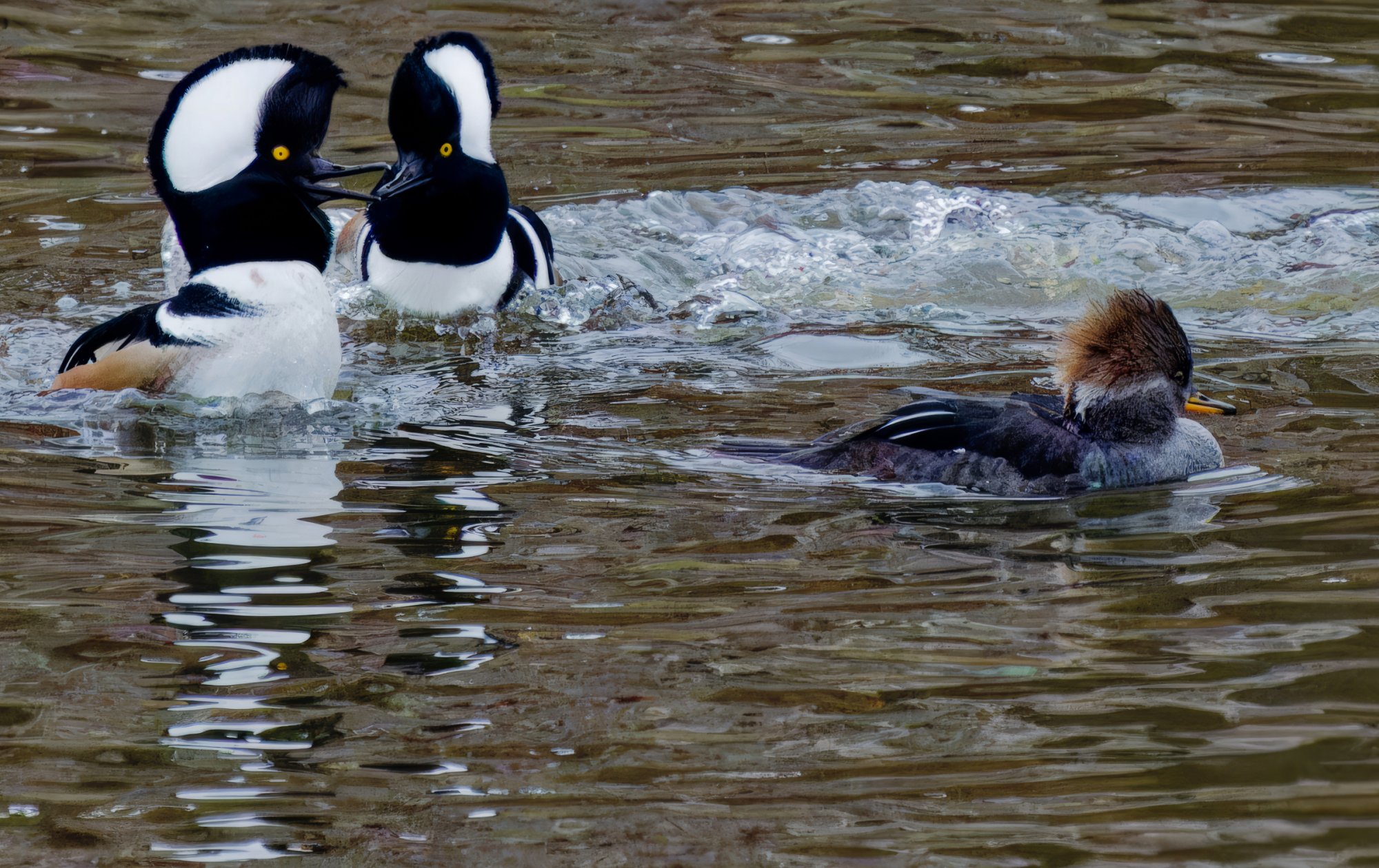 LOL! Actually, the other three male Hooded Mergansers had already swum away, leaving these two guys with the sole gal. They had all put on an amazing show for her (and for me!), with lots of posturing and splashing around in order to impress the lady.....and then it was down to just the two. One of them went through some more elaborate attempts to be the one who won her heart, and the other one then swam off. It was the little lady's turn to perform, and she did with lots of splashing and also lying in the water submissively. The male simply watched..... Then at the end of it all the second male returned and the three of them swam away together. ??!The one not in frame 🤭