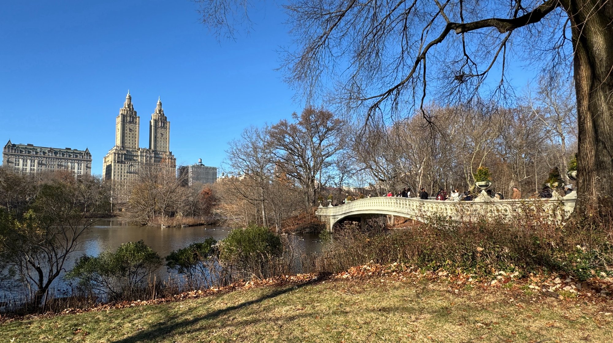 Central Park NYC - cast iron Bow Bridge in FG and San Remo in BG
