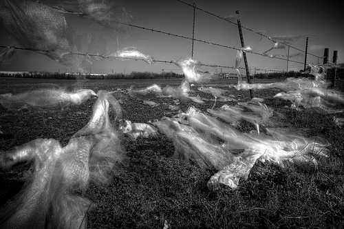 Are they really plastic bags?? It looks more like sheep's wool to me! Where I go on holidays in Ireland the house is surrounded by barbed wire covered in wool, just like this photo - surreal!