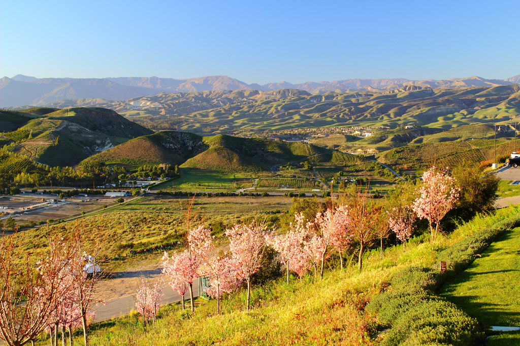 This is nice. The sunlight and the golden mountains draw the eye into the picture and the pink blossom of the bushes with the light shining through gives interest to the foreground. Might it look better with that bit of pink bush on the right cropped out? Don't know, it looks good anyway!