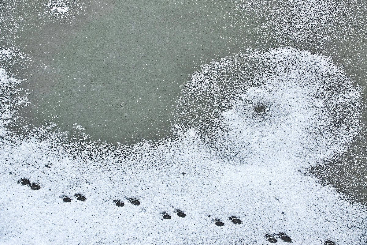 Could be a beaver? But I’m no expert!I think probably it was a goose or two or three.... Maybe the Hooded Mergansers. I haven't seen any out there, so they must've been there at a time when I was otherwise occupied. Come to think of it, we also do have beavers around here, and raccoons, but I think both of them would be far too heavy to walk on that thin ice. Definitely wasn't humans!