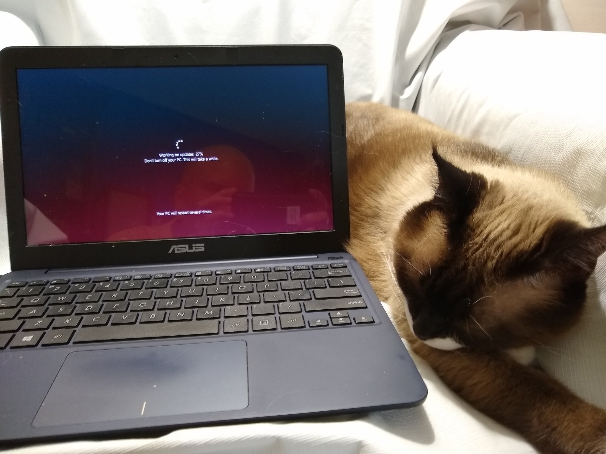 You're IT manager is asleep on the job.This is Sherlock, a Snowshoe (Siamese) cat. Like the message on the PC screen says, the upgrade may take a while, so Sherlock decided to take a nap.