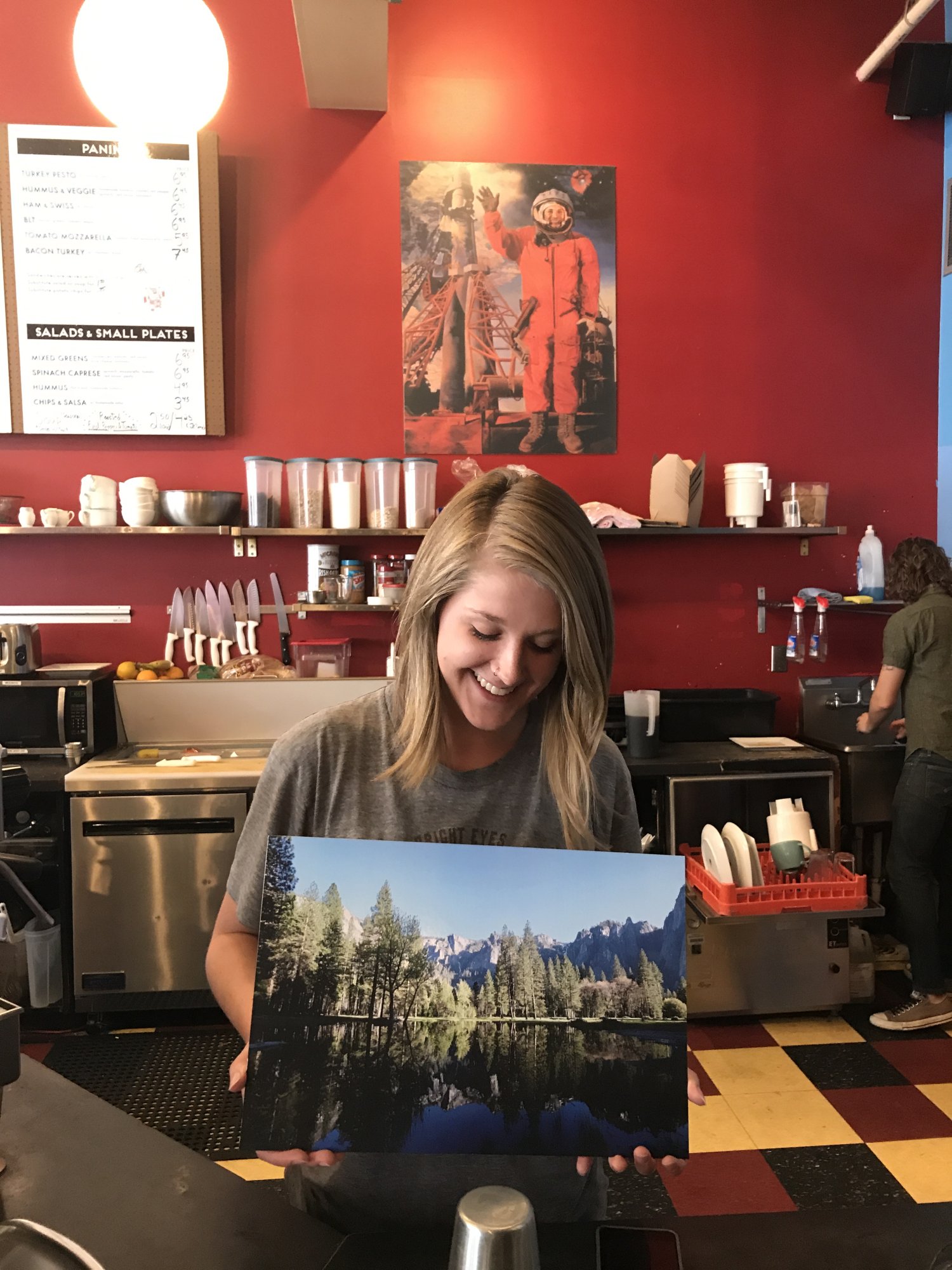 Such a lovely jesture.Hey, sometimes it's nice to gift your pics to strangers. Coffee shop barista enjoying a Yosemite picture!