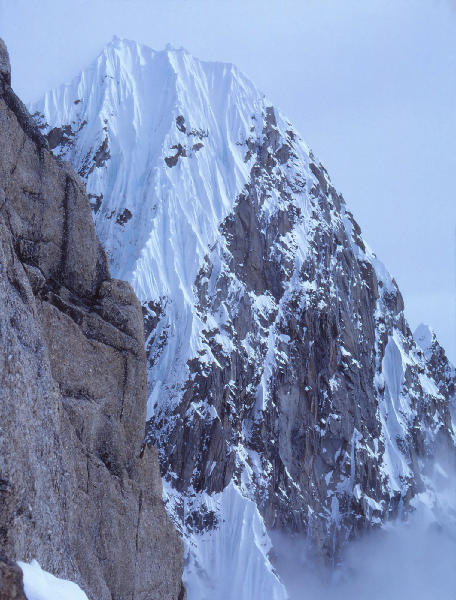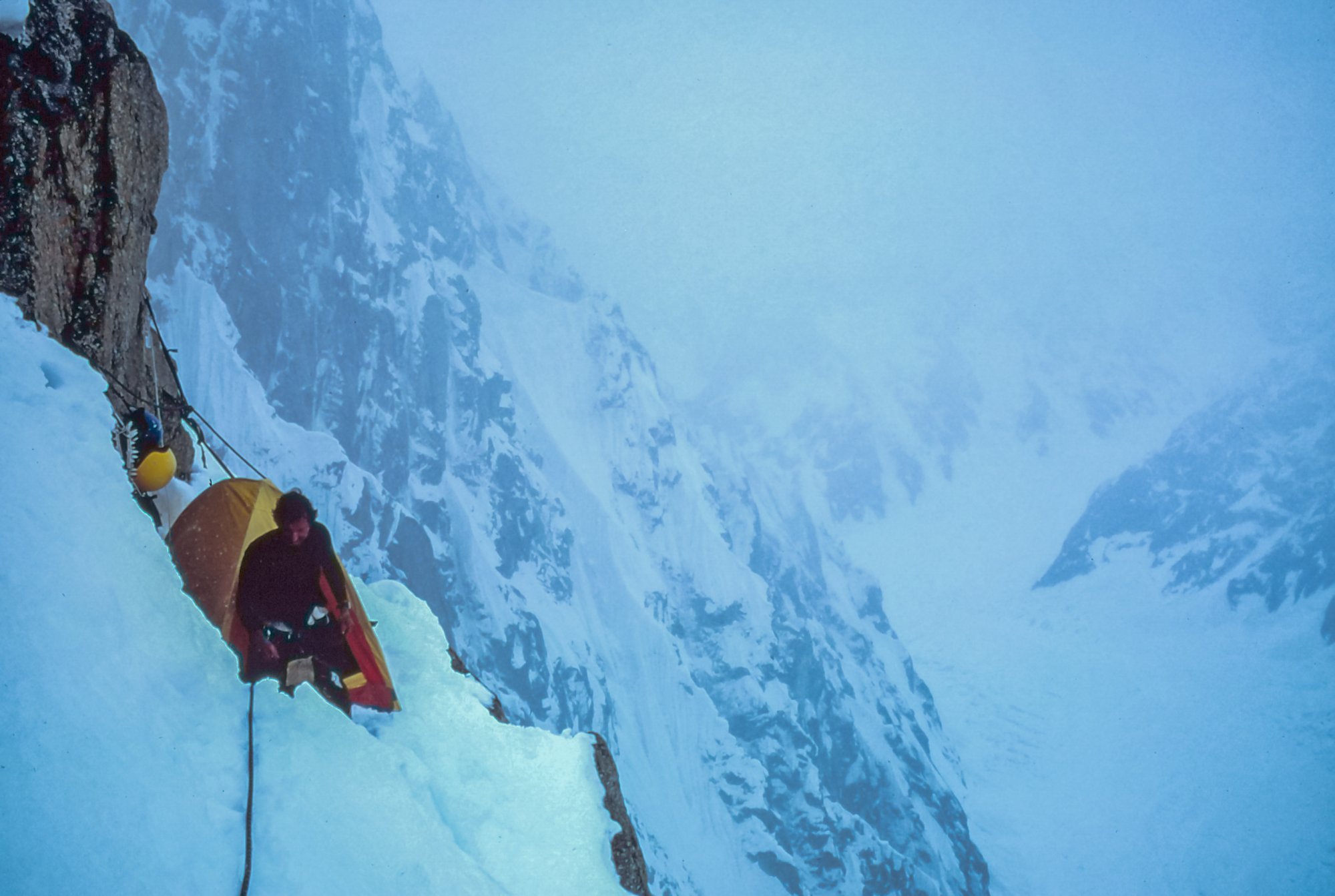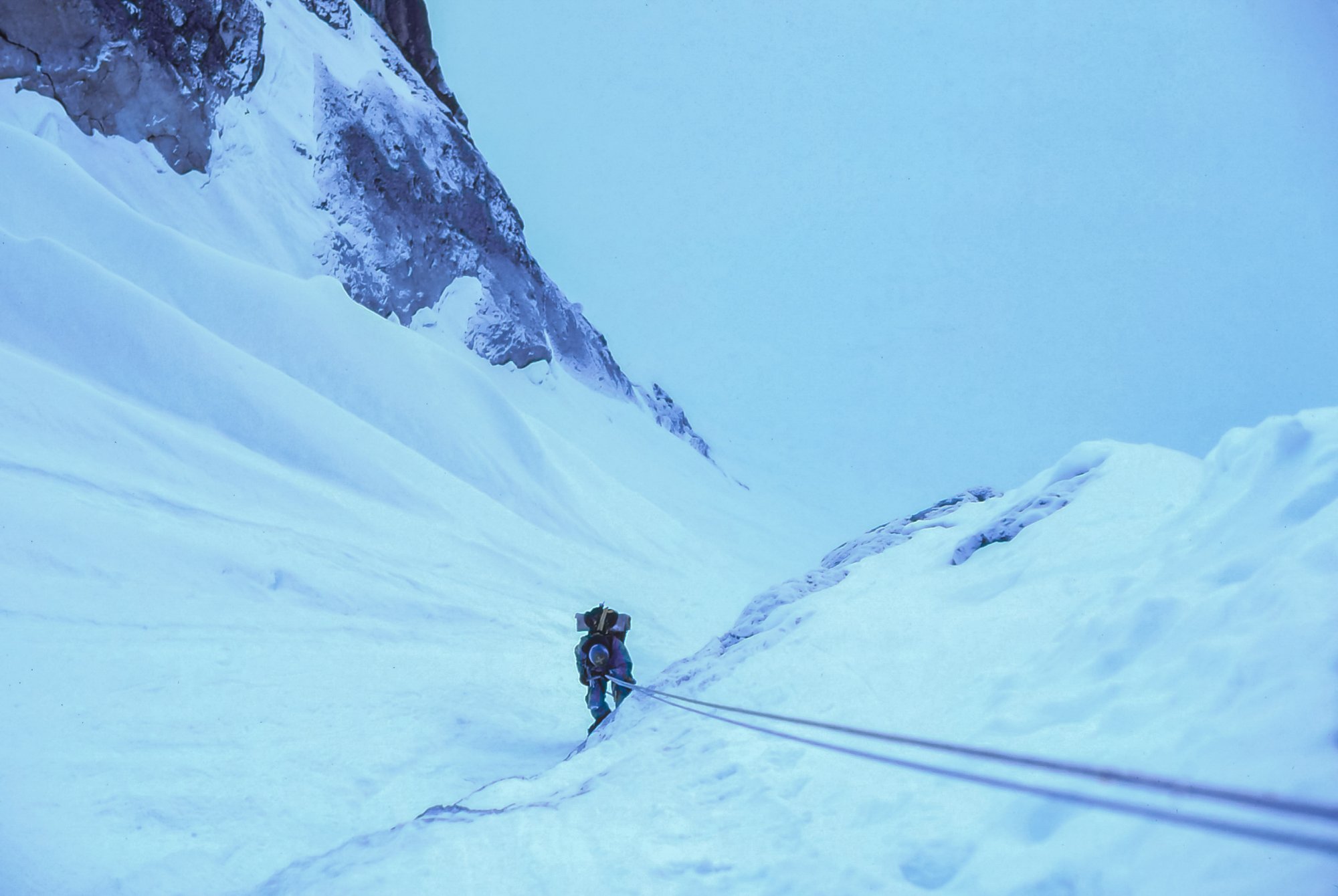 Amazing trip it must have been. Wonderful slides.It's a slide scan from 1980. A buddy and I were attempting one of the first alpine-style ascents of the West Face of Mt. Huntington by a new route. We were in there for 32 days, got very high but were weathered off short of the summit. The picture is actually of me, taken by my buddy with mt camera. The first ascent of the original route was made famous by Dave Roberts in his book, The Mountain of My Fear. I got married 3 weeks after my return (wedding was predicated on our survival).