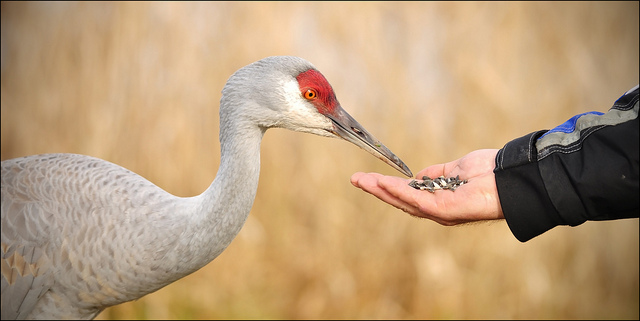The guy who was trying to feed this beautiful Sandhill Crane got too greedy and one of them bit him! There was bloodshed!