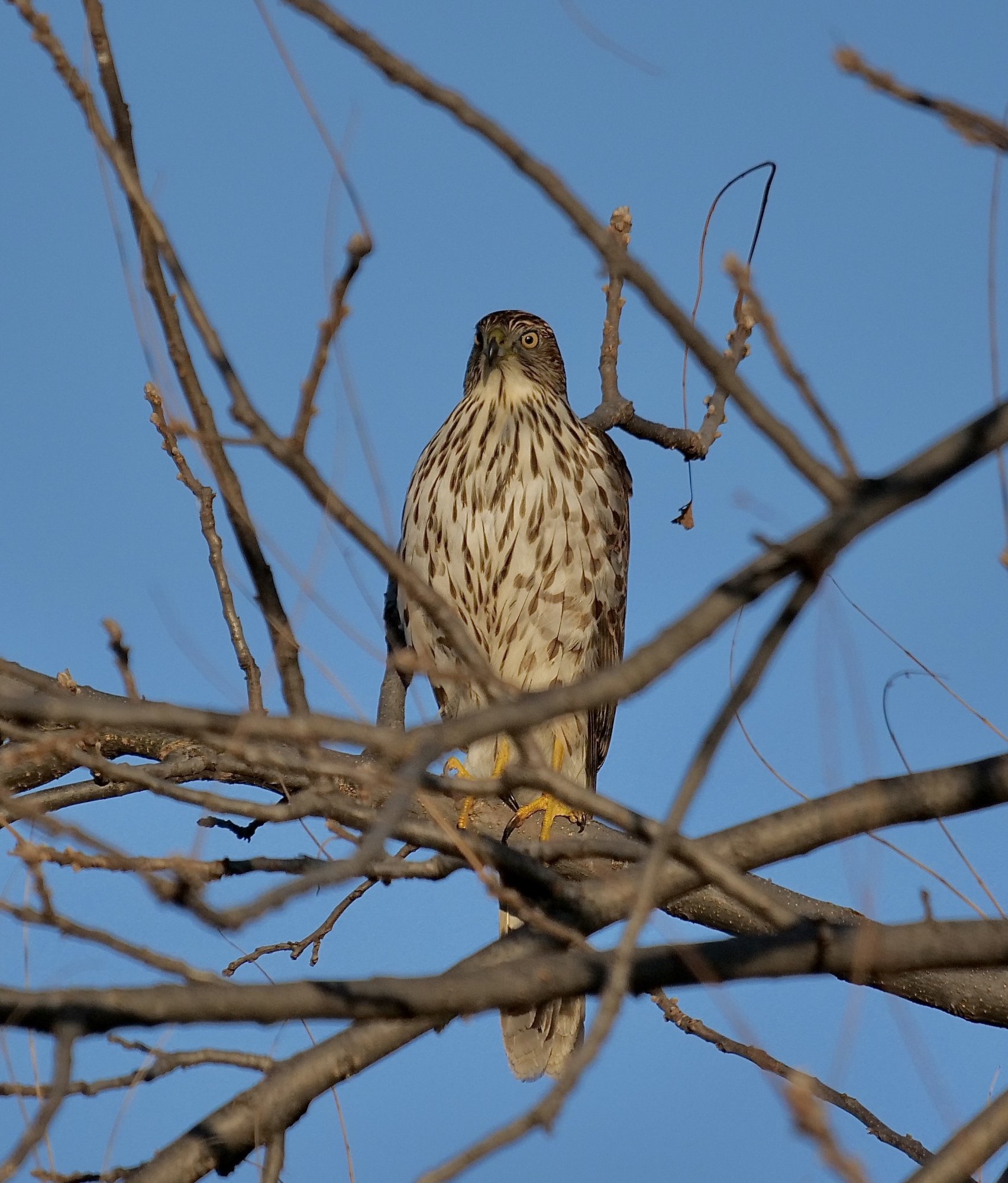 this is an excellent capture, the hawk looks intense and guilty.Probably about 75 feet away before he had enough and fled the scene.