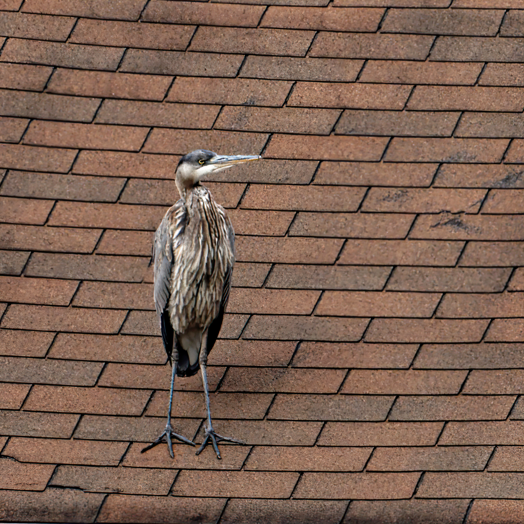 Alfred should be wearing sandals on that hot roofAlfred's back! I saw him yesterday for the first time in a couple of months when, startled, he flew from where he'd been standing in some weeds near the water's edge up to the roof of a nearby townhouse. I grabbed the camera and rushed out to the deck to get some shots. So happy to see him again! He looks a little shaggy in his winter plumage -- but hey, a guy's gotta keep warm......
