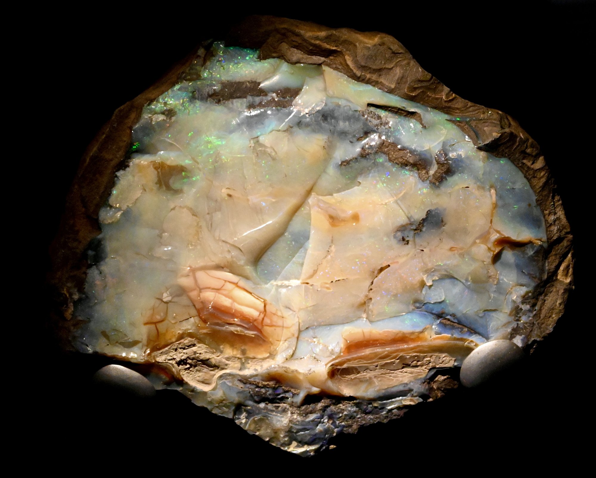This granite-like igneous rock formed as hot magma forced its way into cracks. It cooled slowly, allowing large crystals to form. The pegmatite is loaded with shiny muscovite (mus'-ko-vite) mica and large crystals of a pinkish mineral called potassium feldspar.