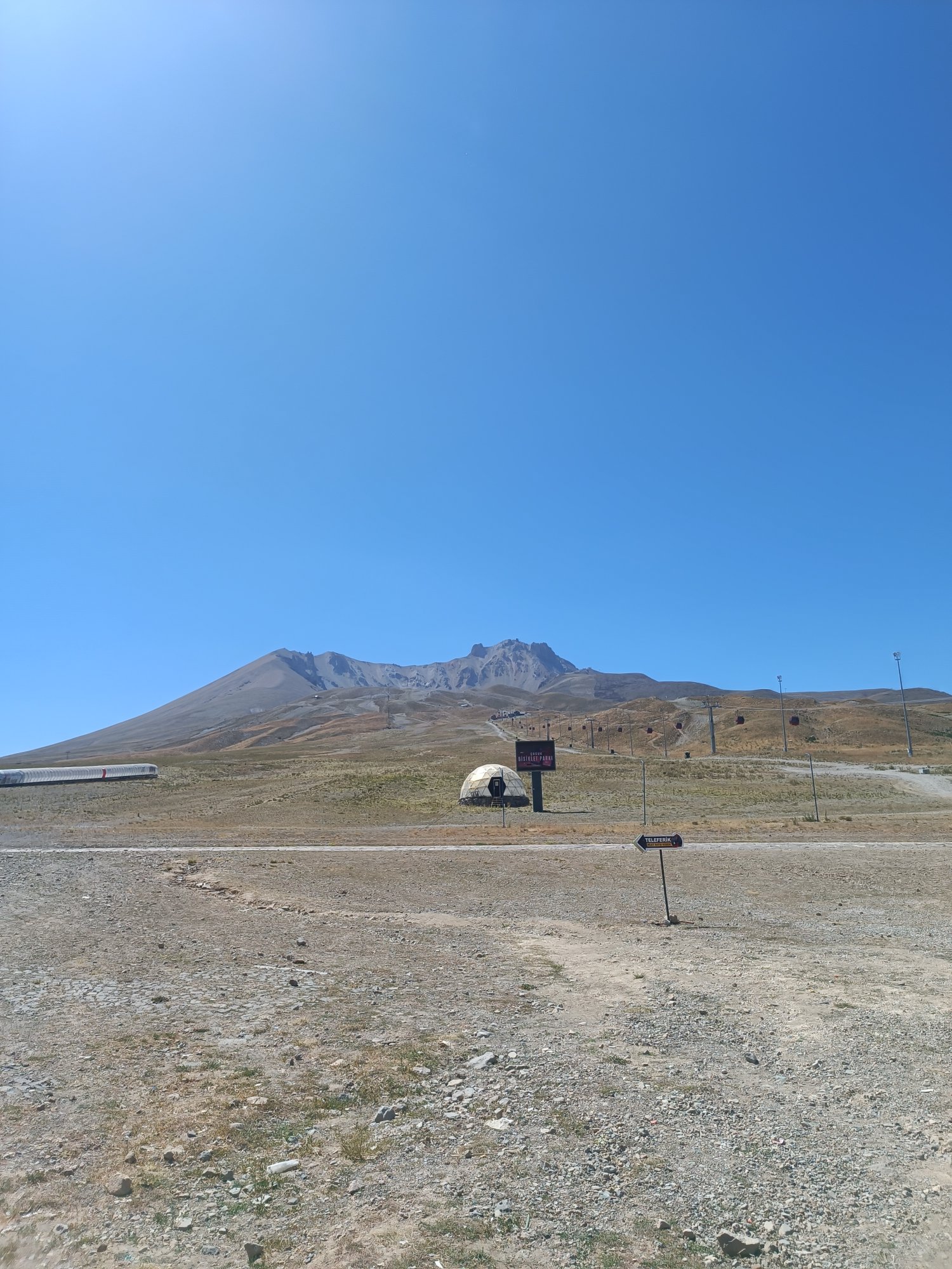 Mount Erciyes. We are 3700 meters above the ground. In winter, it is covered with a huge snow cover. Nice place for skiing. There is a lot of geothermal water underneath. We also go to the spa.