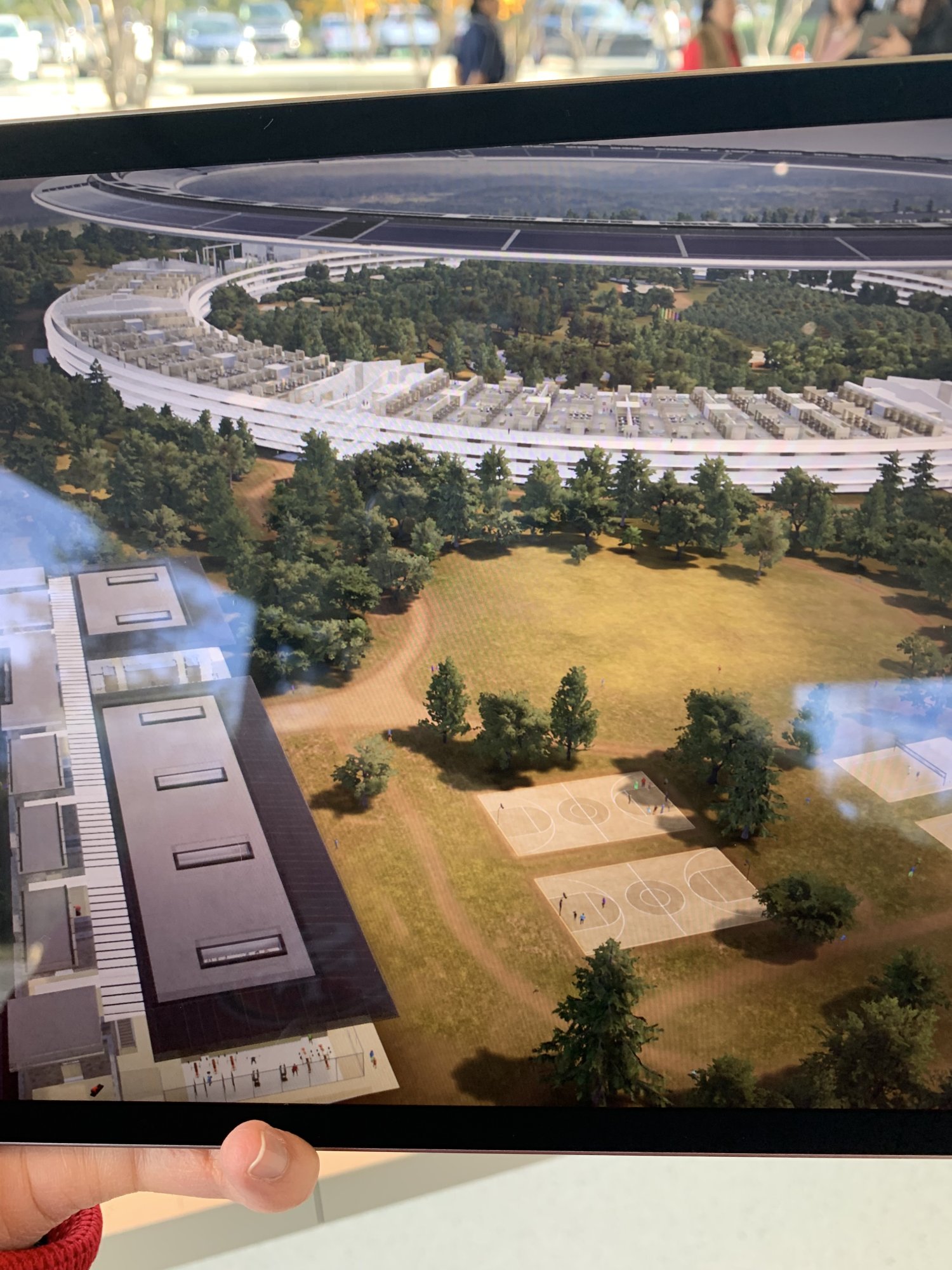 Yes it is. At Apple Park visitor center at Cupertino CA, this one of a kind Apple Store is made for tourists coming around the Bay Area. There is a room where you check out all of Apple Park through AR rendering from an Unreal Engine app on an iPad Pro. The scale model is made of aluminum and has been there since it opened in 2017. Here’s a look at it more further:I was at first a bit confused what was going on there with the floor, but I'm guessing that's a model of Apple Park?