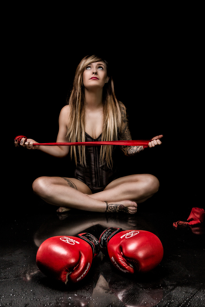 Nice picture. I like the black and red theme. What's the reflective base she is sitting on? Makes the shot look professional, like a pro studio.