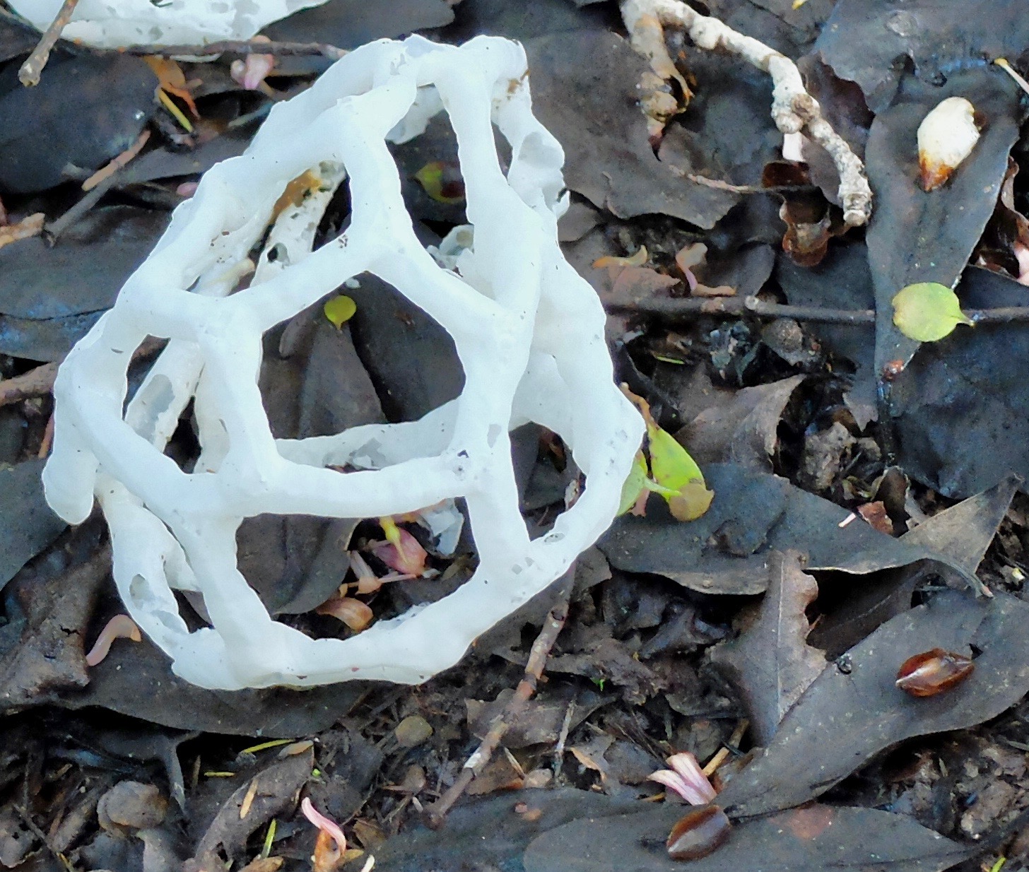 True, at first glance basket fungus, being so white and geometric, looks like plastic packing trash juxtaposed against the dark forest floor. Closer inspection reveals that it is indeed natural.That is one crazy fungus.