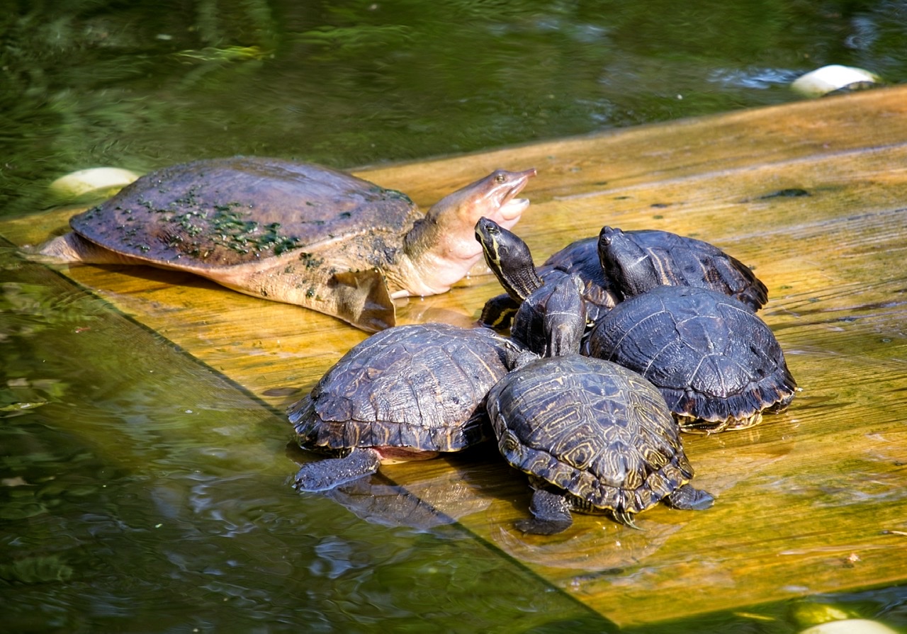 I love how the box turtles are all huddled together in fear of the snapping turtle. They seem very concerned.Turtles on a raft.