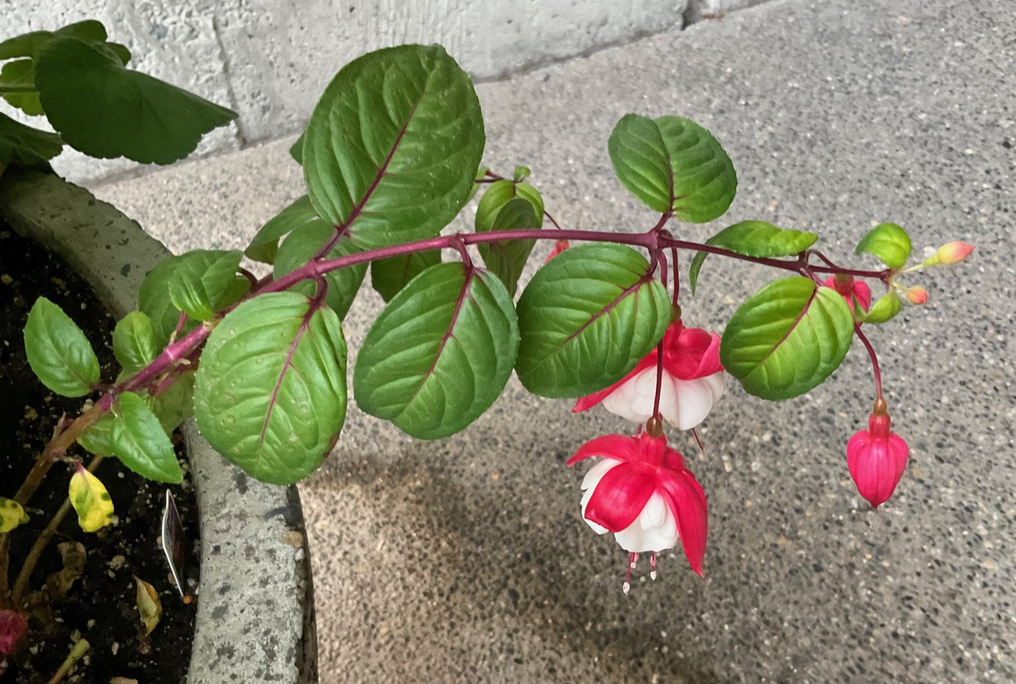 i think this is a fuchsia plant. it’s not coral bells, which is an early spring upright perennial.'Coral Bells' (Heuchera) ... in a flower pot -- cute, look like Christmas tree decorations - morning walk discovery yesterday.