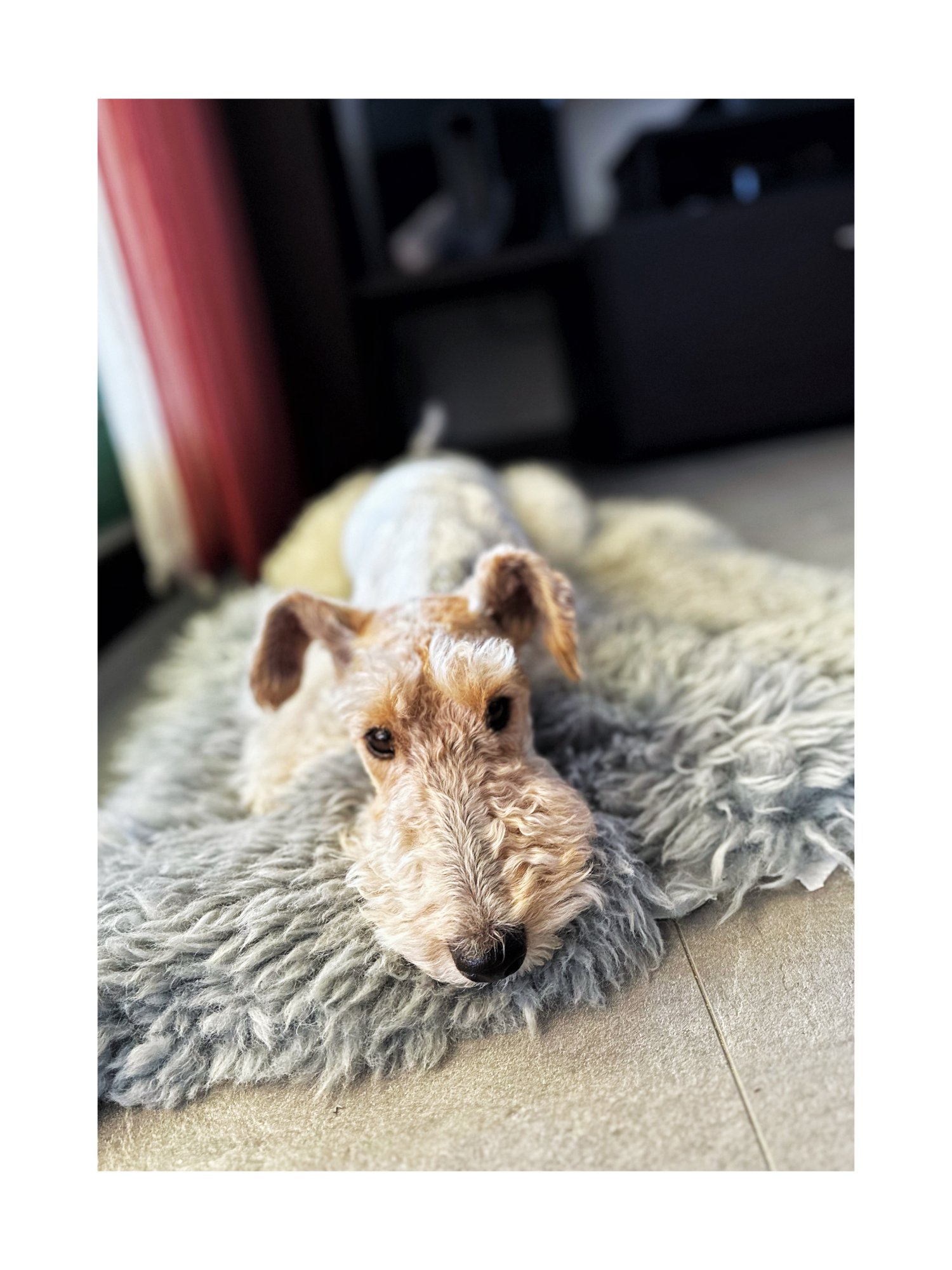 .. our Kerry Blue Terrier used to lay out like that .. and when sleeping, our cat used to sneak up and attempt to pull his whiskers - Blitz (dog) was a real gentleman though -- took what he could take of such action, and then just got up and left the room.