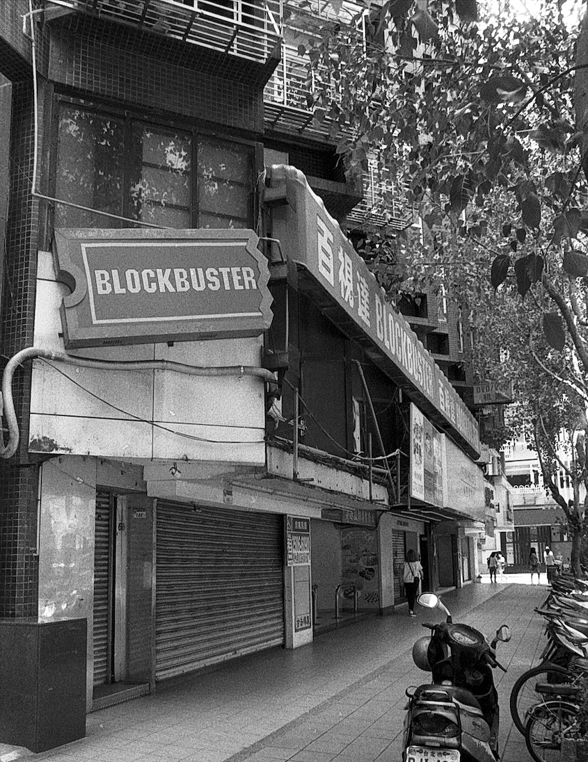 A storefront in Taipei. abandoned ever since Blockbuster closed goodness knows how many years ago. Shot with a Nikon F6 on Kentmere Pan 400 b&w film metered at ASA 800.