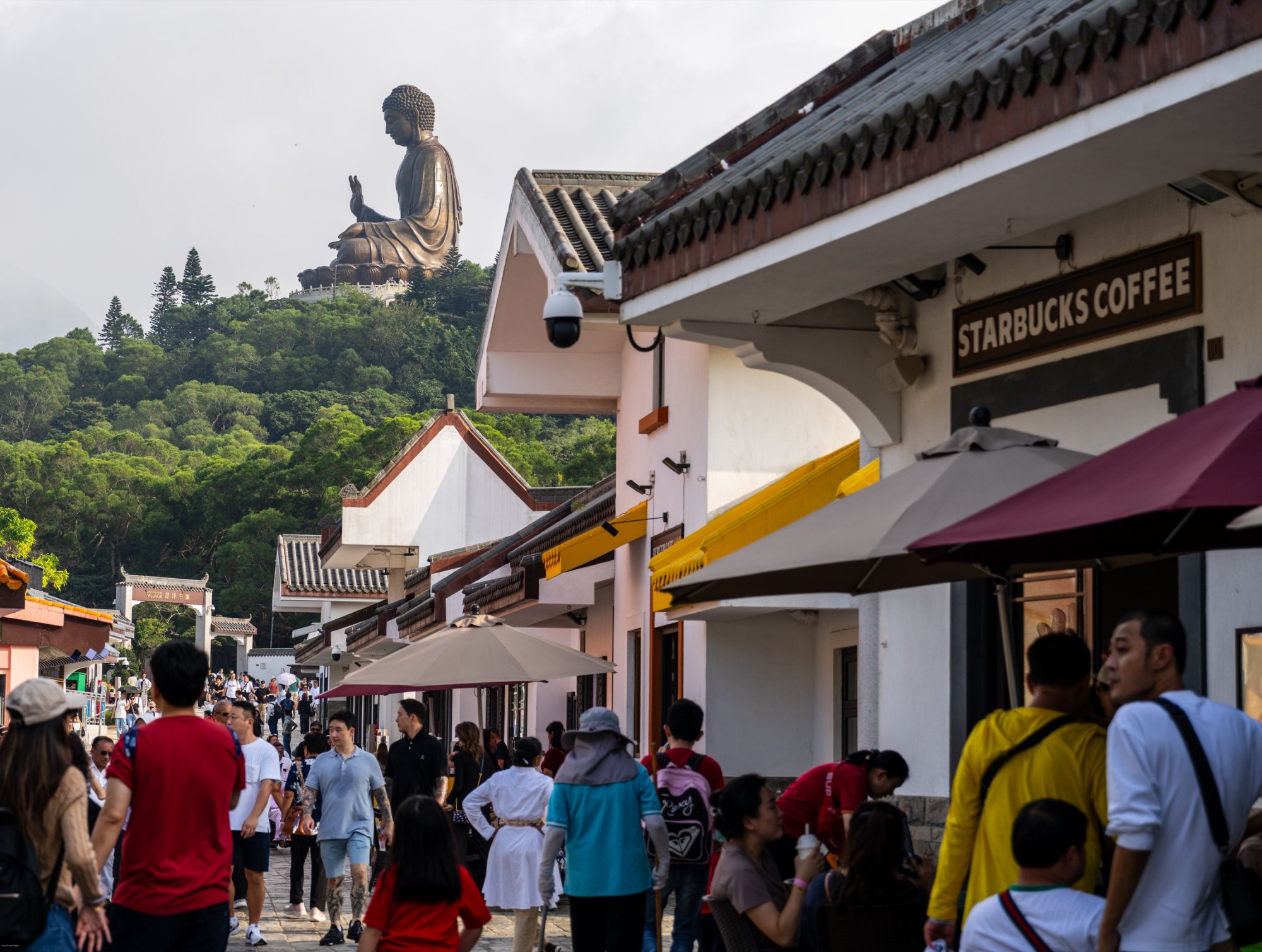 The Tian Tan Buddha watches over Ngong Ping. Lantau Island, Hong Kong SAR, China. October, 2024.