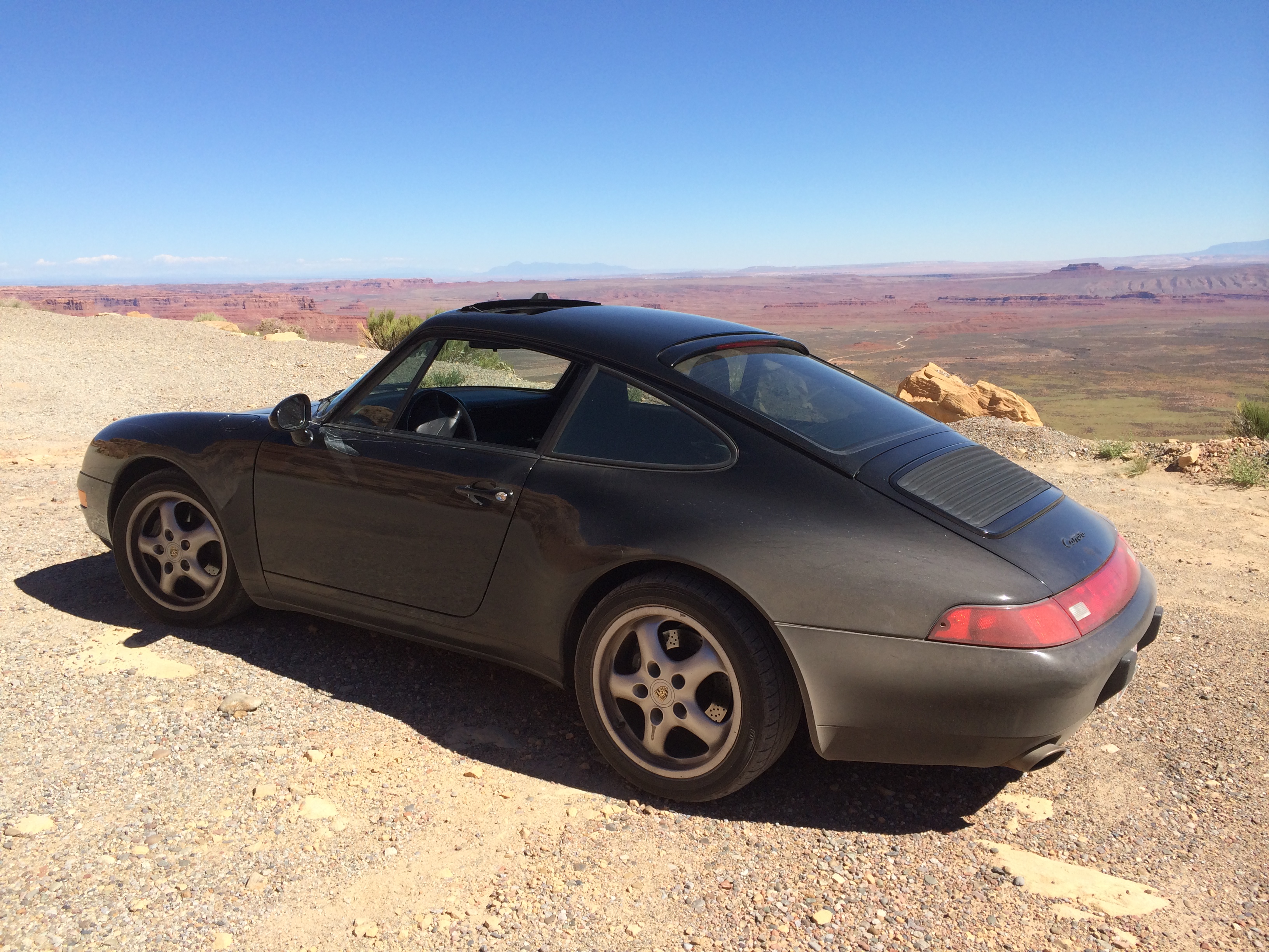 I , sadly , am stuck with a Subaru rental for this trip . Been on a bunch of nice open roads , but with my luck I'd be barreling along and either a cow would hop in front of me or that pickup waaaay back there would be the Navajo Tribal Police .Yes, I most definitely did the Dugway in the Porsche.