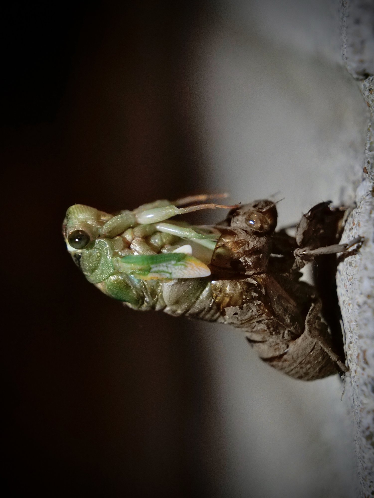 It's a fascinating process, observing the transformation of an insect like this. I still recall with great pleasure spending four hours a few Christmas days ago watching & photographing a Dragonfly Nymph as it became the glorious winged beast! 😎The insect? It’s a cicada. Likely the dog-day cicada. All through summer you can hear them ”grinding” in the trees seeking mates. They spend most of their lives in the ground eating roots, then emerge to mate and lay eggs in trees. From what I gather, the final form has no mouth, so it does not eat. This entire process of emergence took about 40 minutes or so. I have 2 pictures to go after this one.