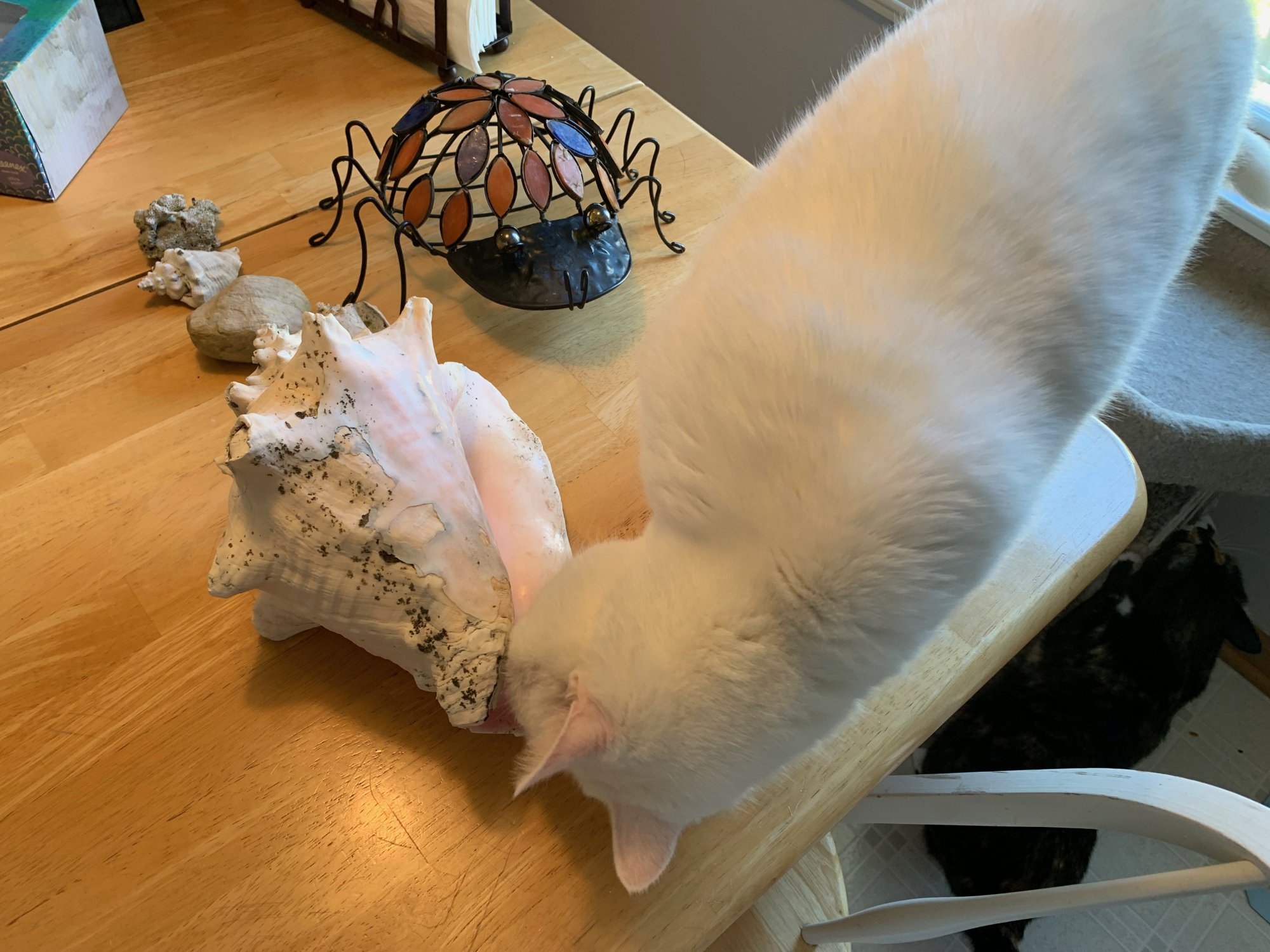 So in preparation, I removed the stuff we had on the landing and brought it inside, including the large sea shell in the photo below. As with any new thing, the cats have to check it out.