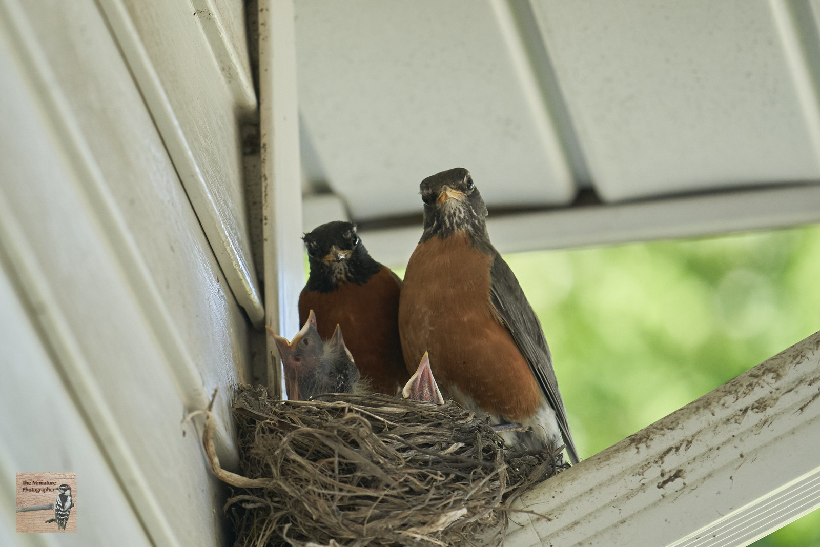 As you may have seen from my recent photos, we just had 4 fledglings leave the nest. On a darker note, a raptor of some kind appeared to have killed a robin in the backyard, and we're hoping it wasn't mom. Hard to tell since we have quite a few robins around. I am also surprised you have 2 adults in this shot, we only saw one the entire time here. Nature sure is tough.