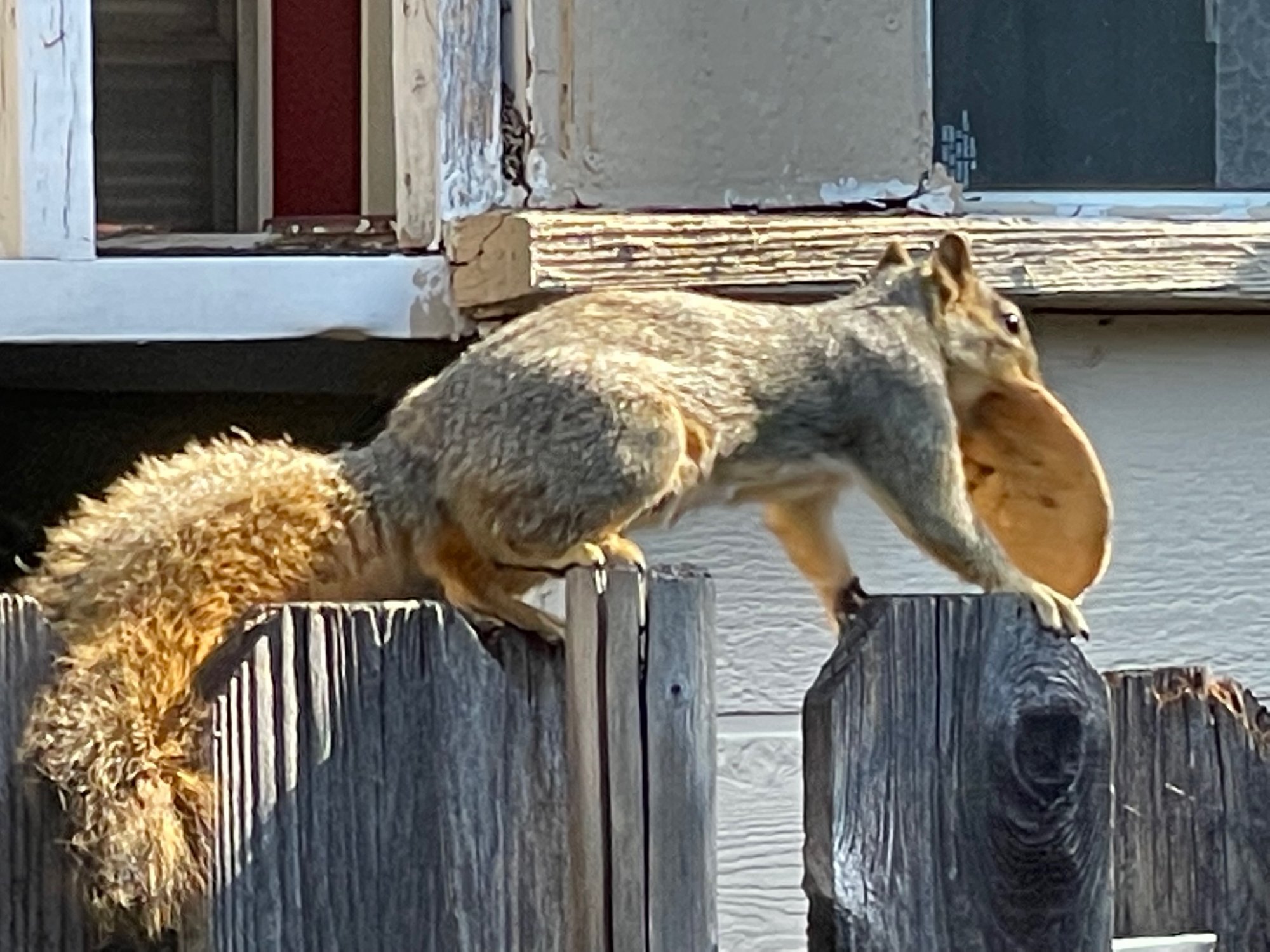 My neighbor put a rather large cookie out for the squirrel, didn't expect him to make off with it in one piece!