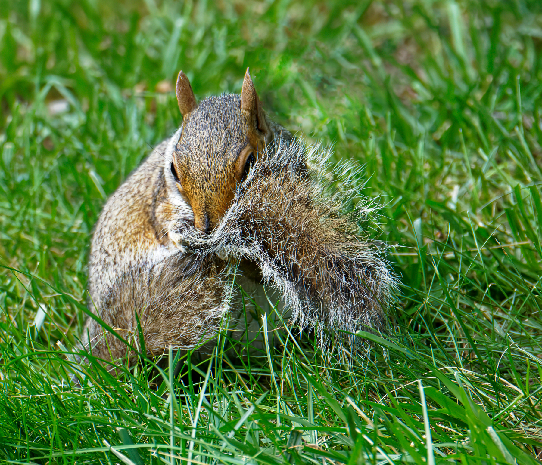 It says a lot about your beautiful energy while you were observing. All the wild animals have to be feeling pretty safe before they will groom out and about. I am happy for you!!Thank you! In all the time though the years I've seen and been more-or-less observing our squirrel population here this was the first time I'd seen one do that with his (or her) tail. Earlier the squirrel had been foraging for food in the grass, and I'd captured a couple of shots of that and then he or she stood there for a short time as I quietly stood watching, and suddenly grabbed that tail and went to work. I was fascinated!