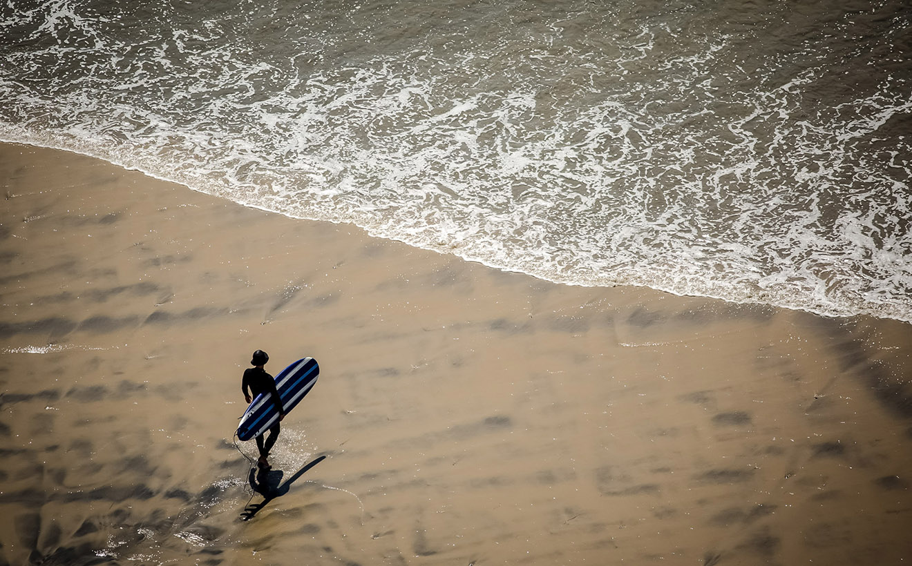 A surfer in a wetsuit walks to the waves at Black's Beach in San Diego, California.