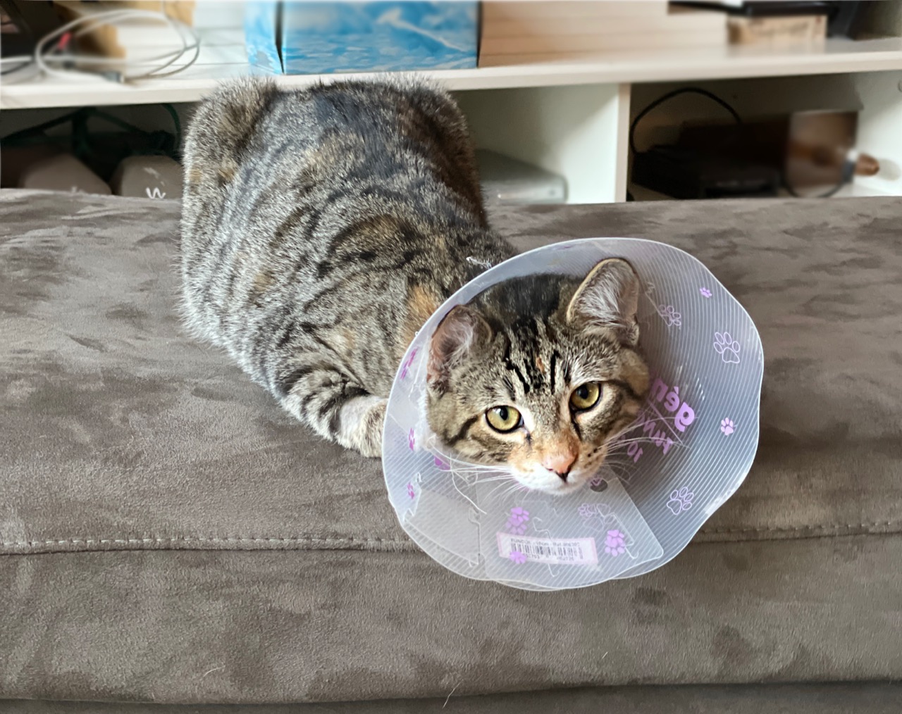 They are family kittens, not just ours 🙂 Kind of shared animalsOh, I think maybe some of us( read me, so sorry) were noting her bit of maybe "down" energy? Maybe sick of the stupid cone? (I know, I know, it has to be on)I know the surgery is a little bit harder on the females than the males, too. She's beautiful and looks extremely loved and cared for!! Do your kittens have names you'd be willing to share?
