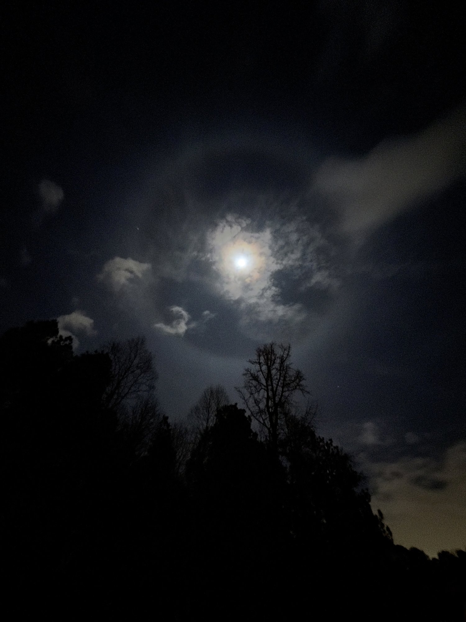 22 degree halo. Caused by ice crystals in the high altitude clouds. Light gets refracted at 22 degrees.Moon halo I caught out on evening dog walk in March. It was spectacular. I wonder what causes this?