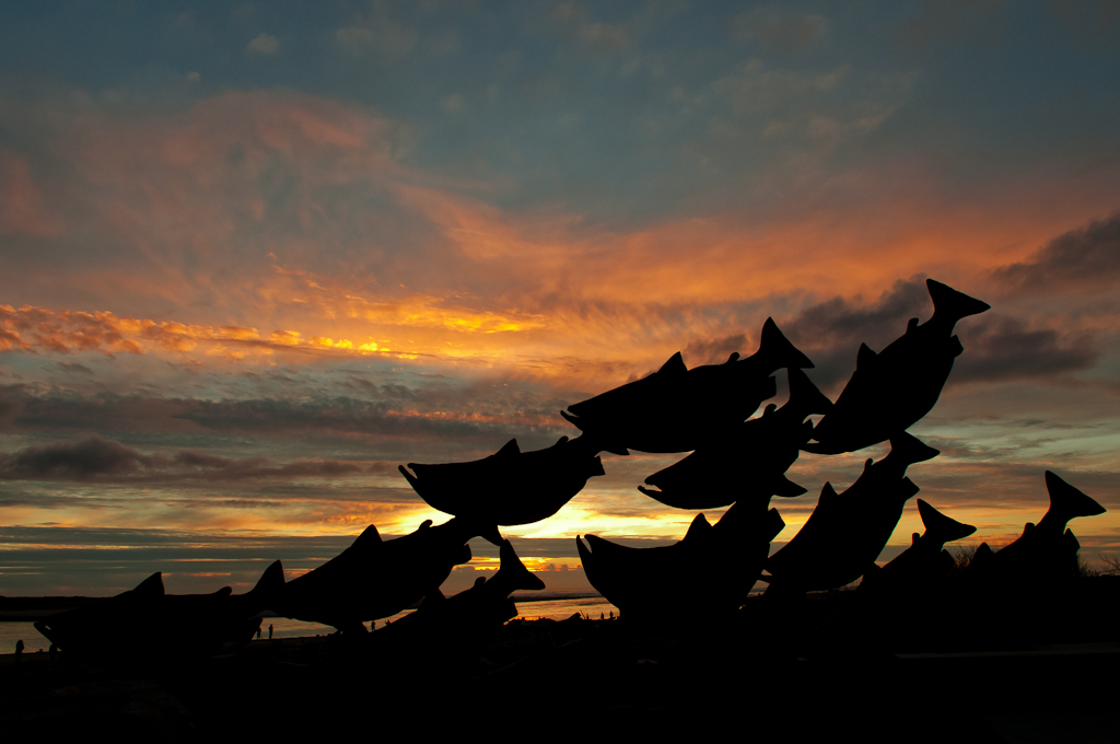 Very nice. I bet those salmon were as pink as the sky ! Nice silhouette plus its neat to see the people between the fish. BJ