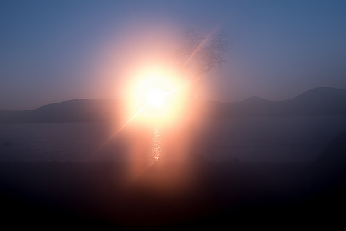 I came down from Conic Hill (small lump of ground next to Loch Lomond) and it was cold. Stuck the camera on the back seat of the car which had been in the weak sun, drove 5 minutes to milarrochy to "that tree" and then got camera out and found lens was fogged up as I took this image... then looking at it, I kind of like it... total fail but you can see the tree is in there somewhere
